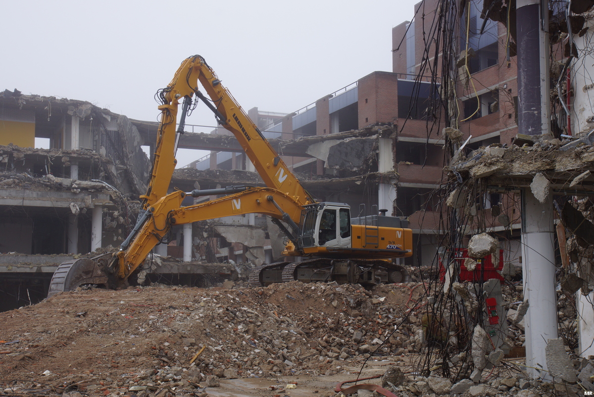 De sloop van het voormalige hoofdkantoor van de Luchtmacht aan de Binckhorstlaan is nu in volle gang. Aan de kant van kasteel Binckhorst is al een grote hap uit het gebouw genomen.