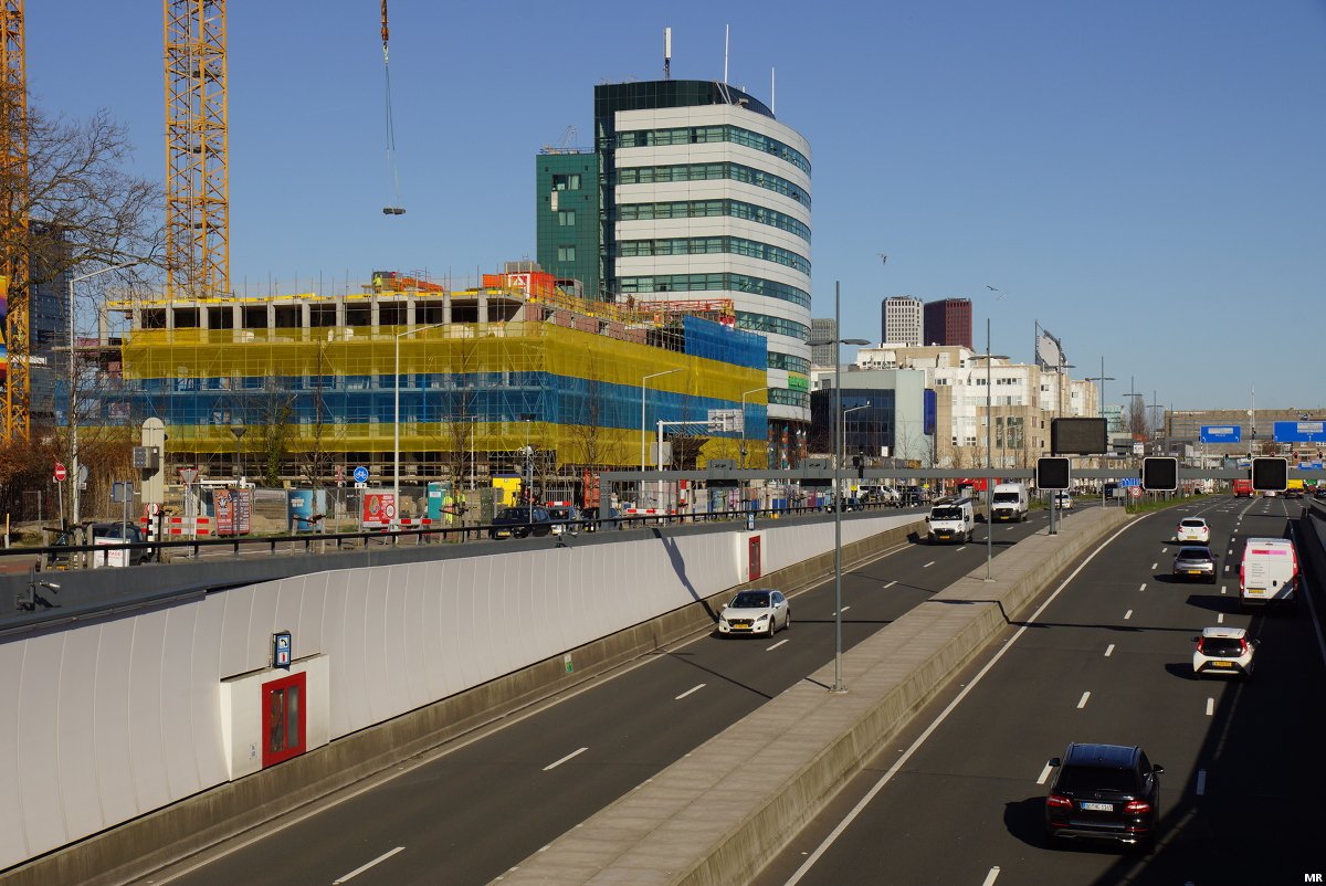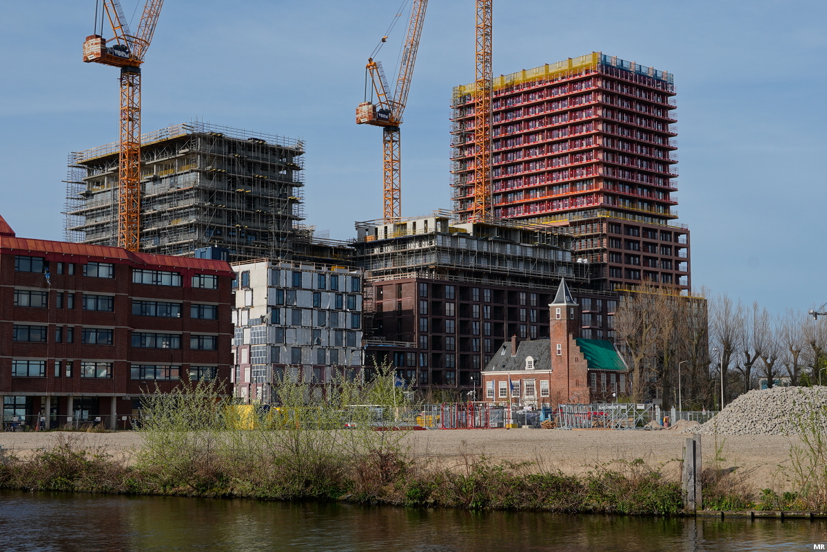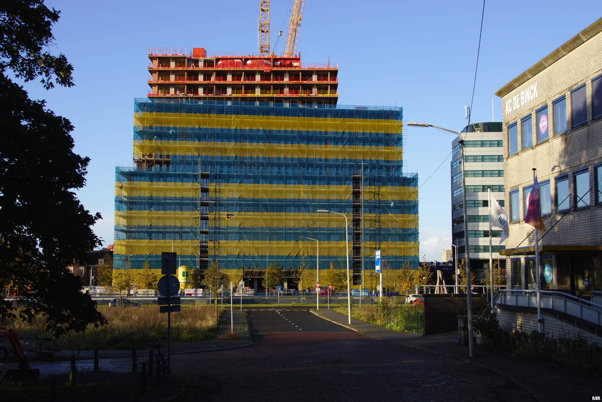 Aan de Binckhorstlaan staan de eerste 4 bouwlagen van project Binck City Park overeind. Dit blok wordt uiteindelijk zo'n 75 meter hoog, dat is een keer zo hoog als het Teleport Hotel op de achtergrond.