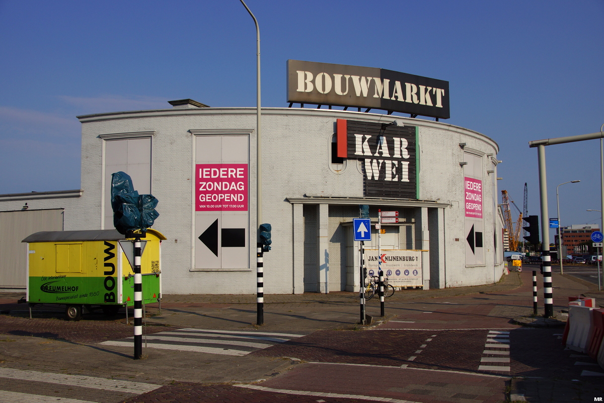 Sloop van de Karwei op de hoek Binckhorstlaan/Mercuriusweg. Het is haast niet meer te zien, maar achter de reclameborden en witte verf zit nog best een aardig stukje wederopbouwarchitectuur.