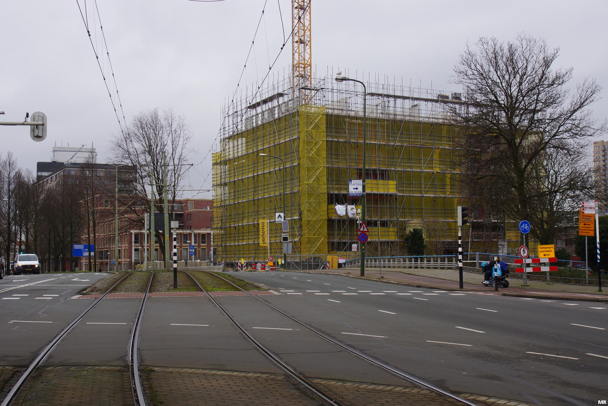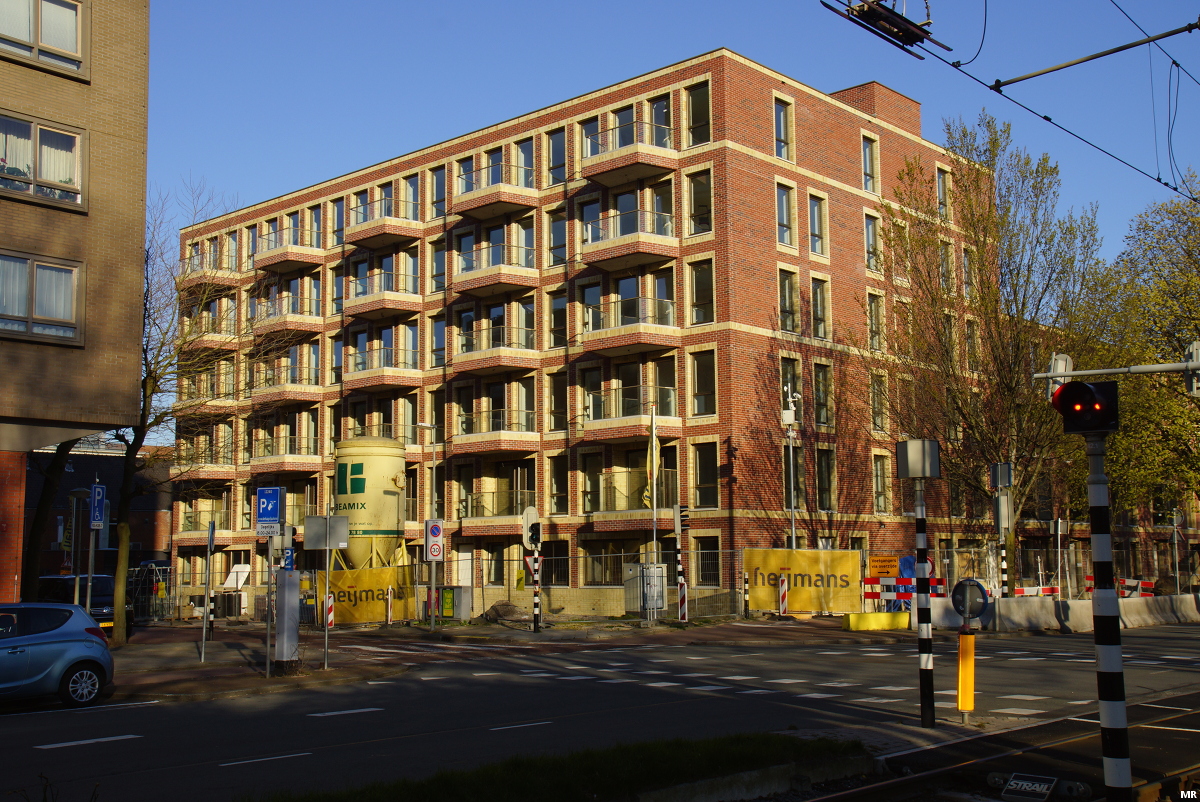 Het kopblok van Regent fase II in de vroege ochtendzon. Het gebouw is bijna klaar, evenals de aansluitende eengezinswoningen.
