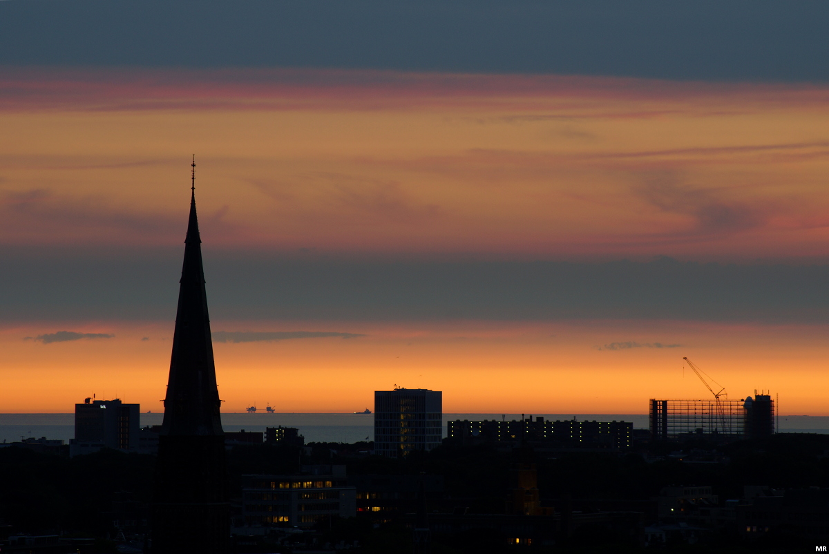 Zonsondergang DenHaag met helder zicht op boorplatform P15 C (42 km afstand) en doorkijkje flat Hoog Lindoduin