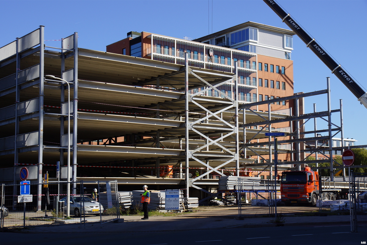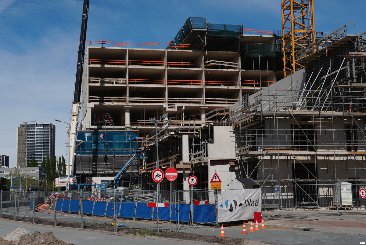 Aan de Saturnusstraat staat de 7-laagse onderbouw van wooncomplex One Milky Way overeind. Rechts op de foto is de eerste etage van de woontoren al te zien. Deze reikt straks tot 76 meter hoogte.