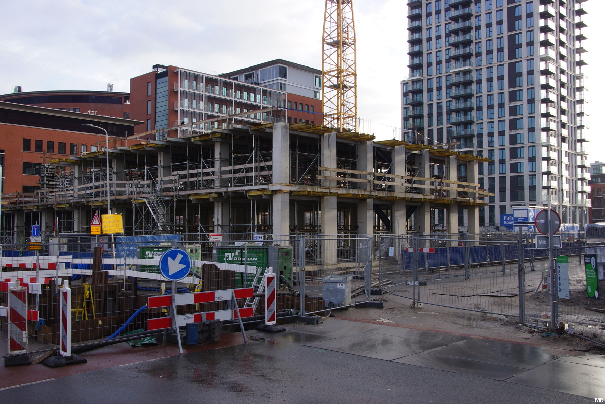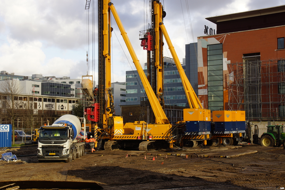 Grondwerkzaamheden ten behoeve van woontoren One Milky Way in de Binckhorst. In oktober stond hier nog een parkeergarage, nu zitten de eerste heipalen al in de grond.