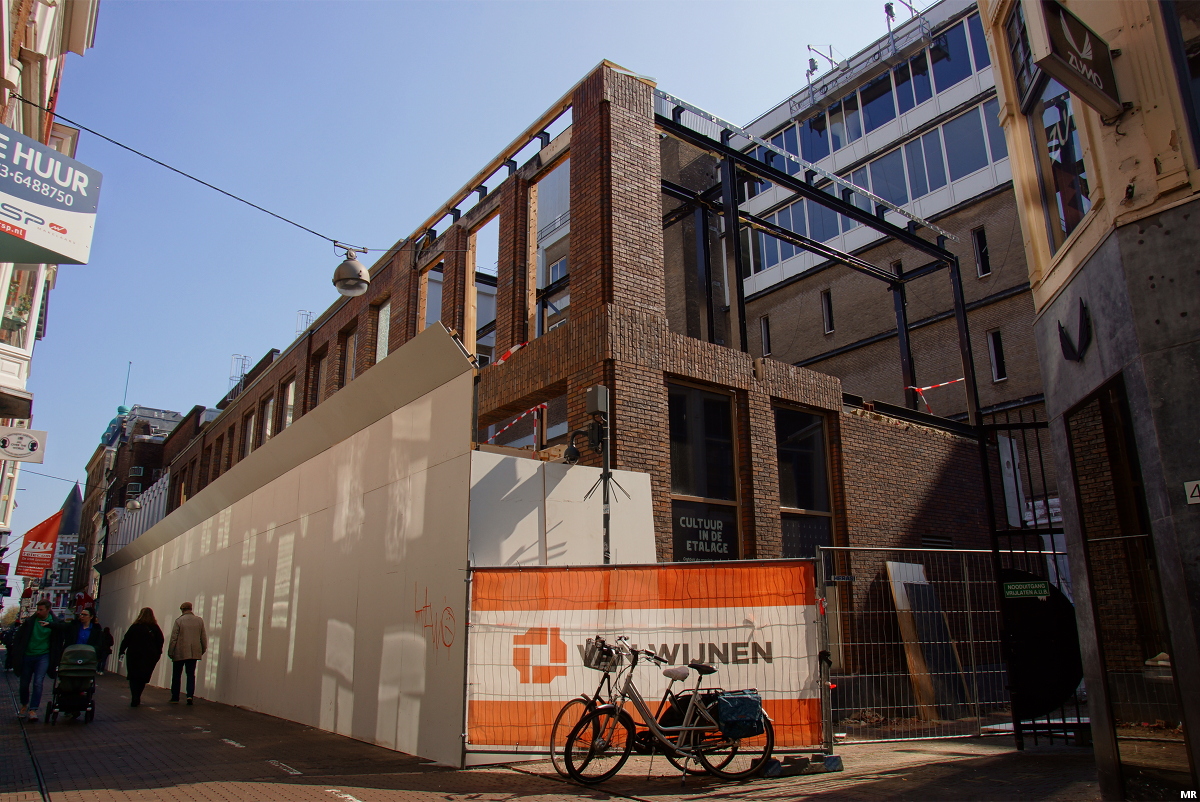 6 jaar geleden gebouwd, nu alweer gesloopt. De voormalige ingang van de V&D aan de Spuistraat maakt plaats voor een nieuwe ingang voor Universiteit Leiden.