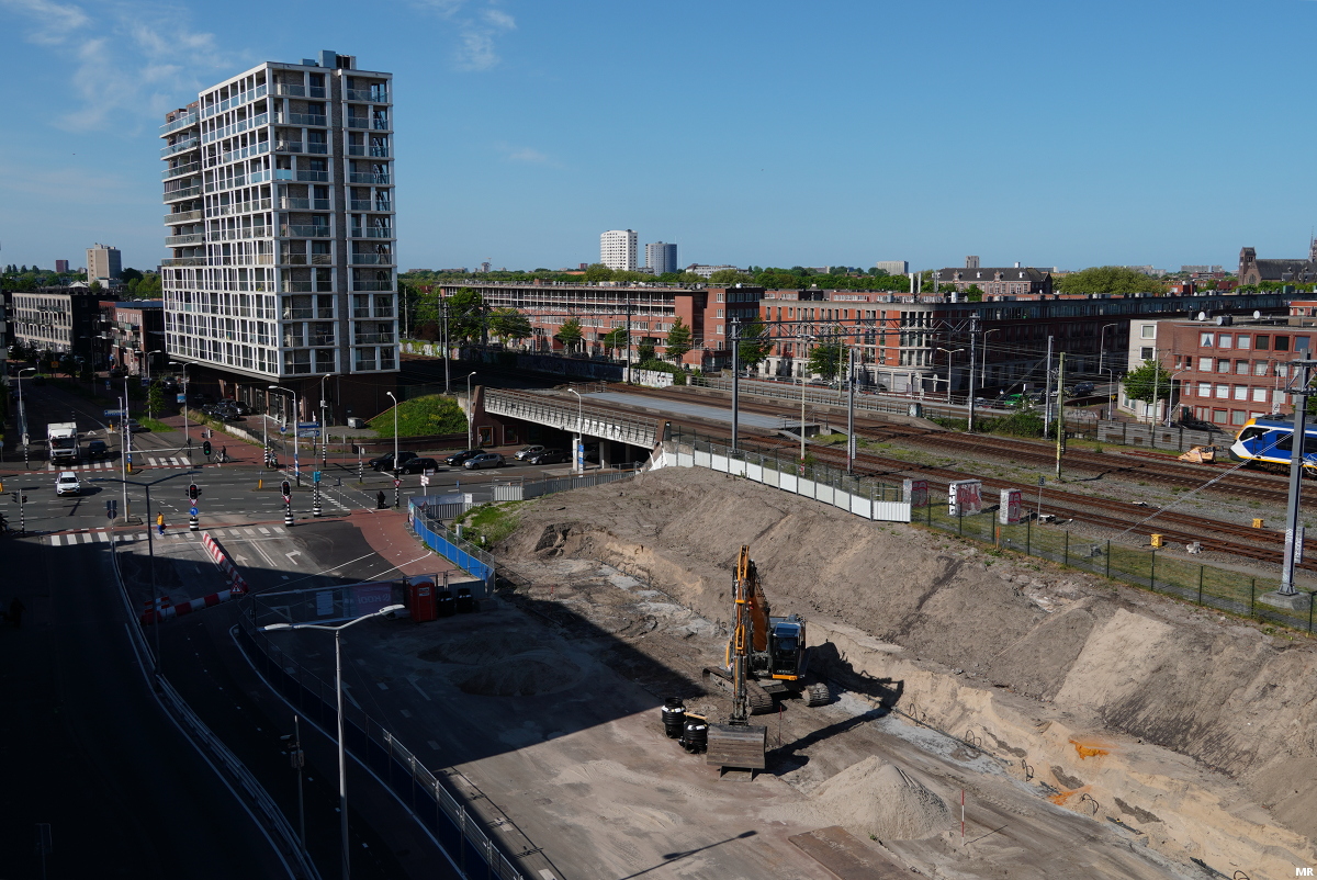 Voorbereidende werkzaamheden voor woningbouwproject WaldorpFour. Tussen de Waldorpstraat en het spoor zullen binnenkort de eerste heipalen in de grond worden gedraaid voor 4 woontorens met in totaal 1171 woningen.