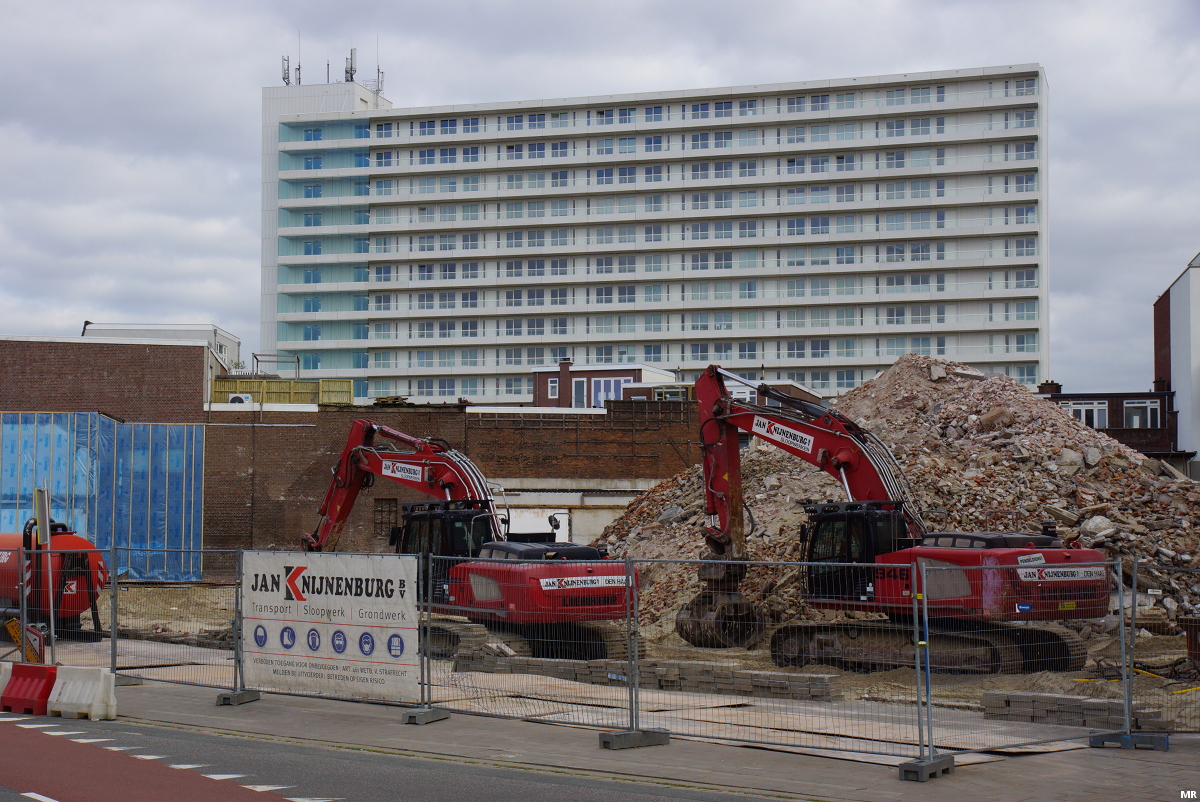 Verdichtingsproject aan de Zeesluisweg in Scheveningen Haven. Zojuist zijn op deze plek 15 woningen, bedrijfsruimten en achterliggende garageboxen gesloopt om plaats te maken voor 121 appartementen. De nieuwbouw zal straks de kromming in de straat volgen en wordt 6 lagen hoog.