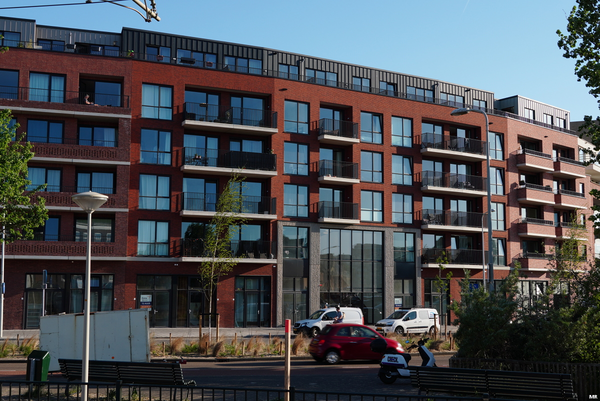 Wooncomplex Zeesluisweg nadert voltooiing. In het gebouw komen 107 appartementen die worden verdeeld over 6 bouwlagen aangevuld met nog eens 14 woningen op het binnenterrein. Mooi hoe de gevel de bocht in de Zeesluisweg volgt.