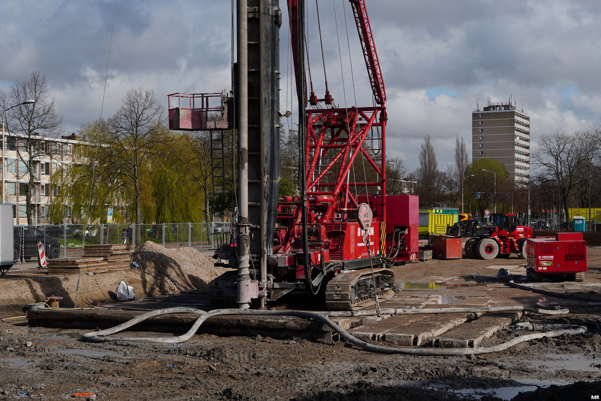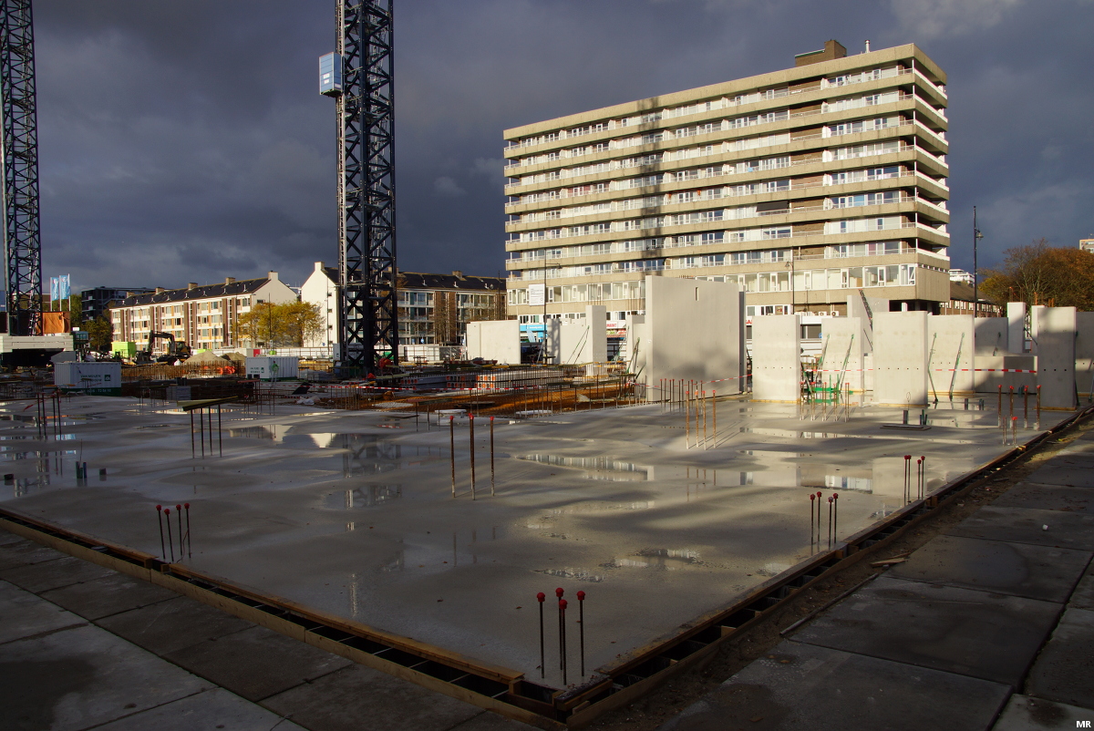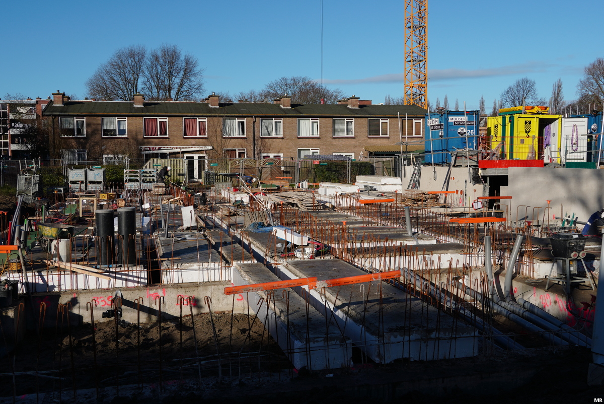 Het beton voor woningbouwproject De Beer zit in de grond. De komende tijd zullen hier twee flats van 5 en 6 bouwlagen verrijzen met in totaal 132 sociale huurwoningen. De nu nog zichtbare eengezinswoningen in het midden worden gerenoveerd.