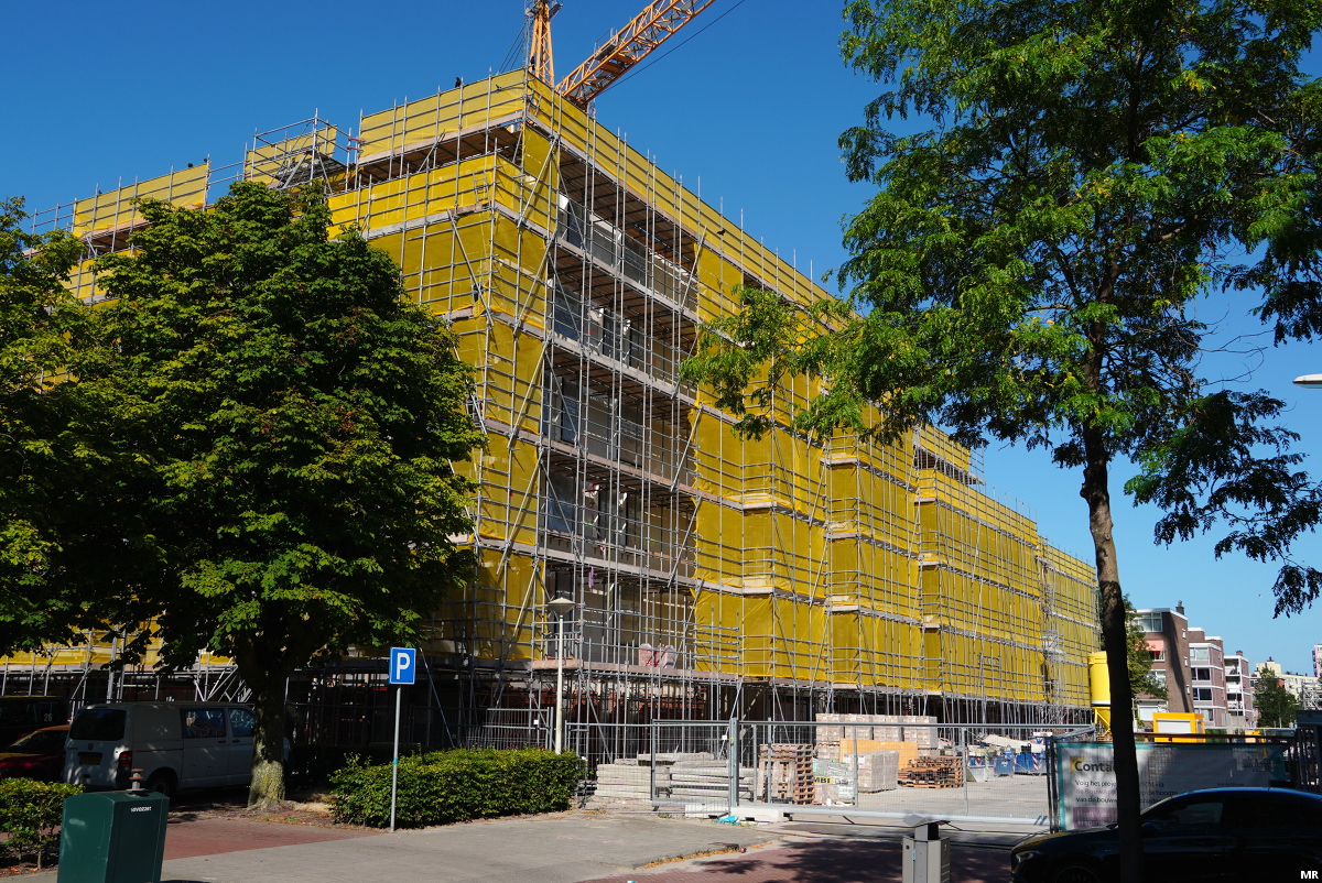 Zicht op project Steenzicht. Door het gele doek zijn 6 bouwlagen te zien, dus het project is op hoogte.
