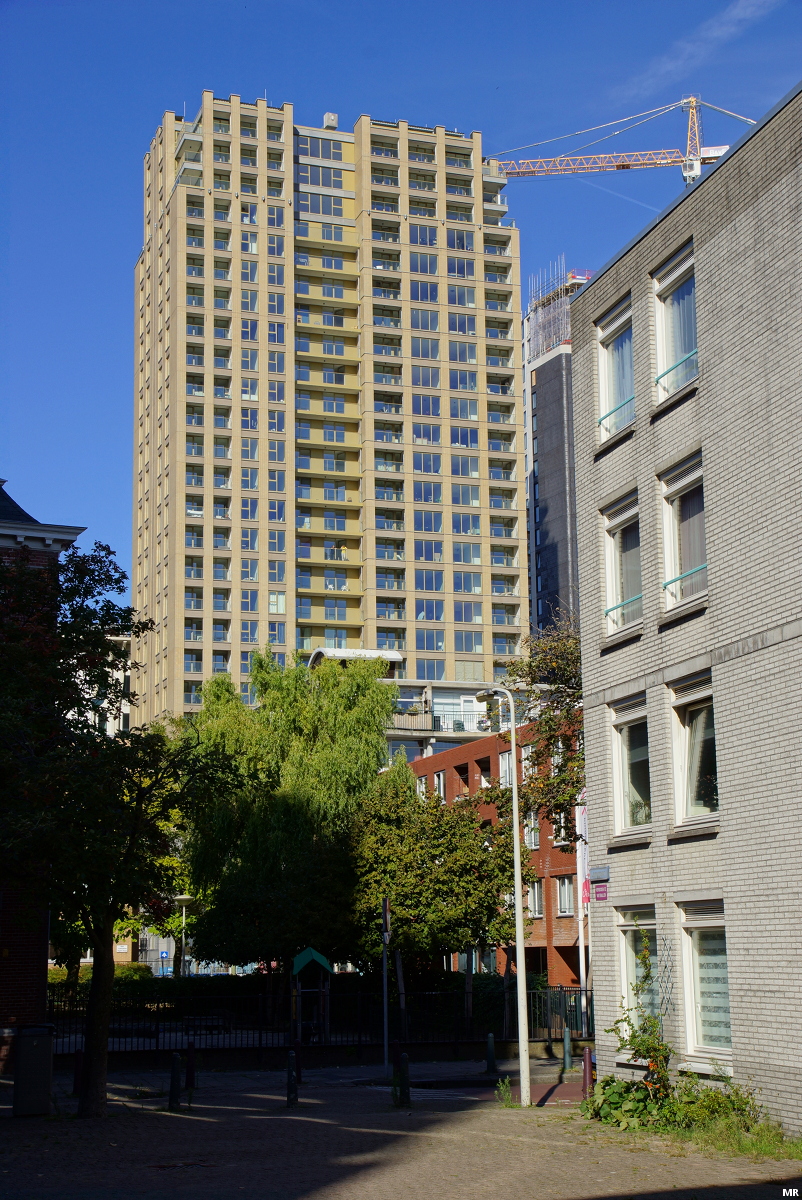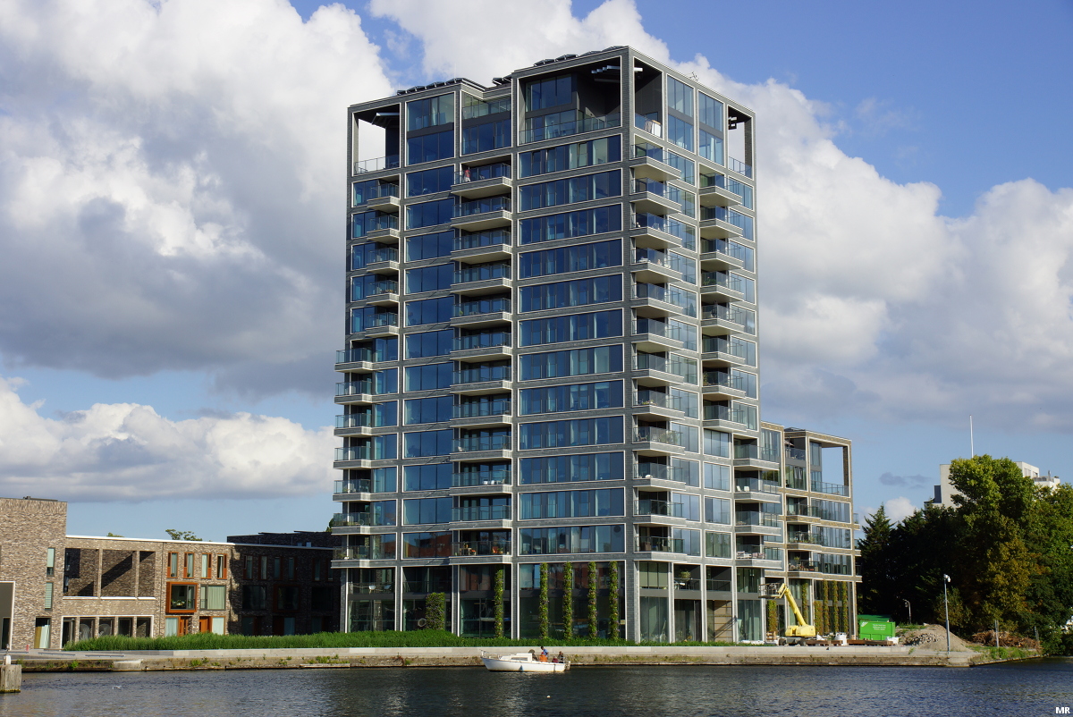 Aan de Schedeldoekshaven is vorige maand de 85 meter hoge woontoren Bolero opgeleverd met in totaal 188 appartementen. Net zoals de torens in de nabije omgeving wordt ook deze woontoren aan de bovenkant beëindigd met kantelen.