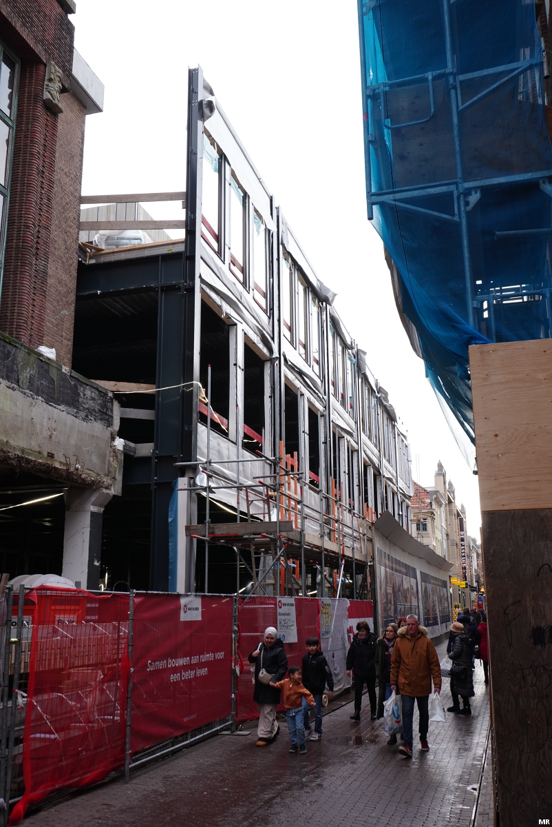 Aan de Spuistraat is een nieuwe drielaagse staalconstructie opgetrokken voor de Universiteit Leiden. De eerst stukjes muur worden nu gemetseld.