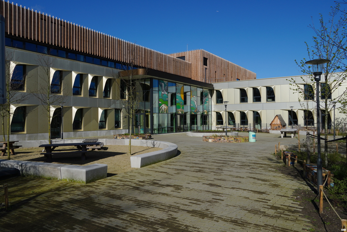Een jaar geleden is aan de Donker Curtiusstraat het nieuwe onderwijscomplex voor het Yes College en Kindcentrum Aquamarijn opgeleverd. Het gebouw valt op vanwege de zandkleurige gevelpanelen en de winpers boven de ramen die dienen als zonwering.