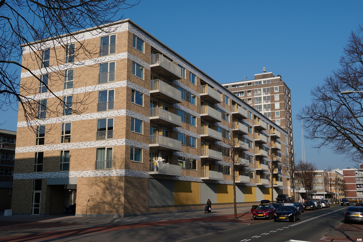 Aan de Vrederustlaan en Hazenrade zijn begin dit jaar 2 flats met 82 sociale huurwoningen opgeleverd. Beide flats worden op de begane grond gekenmerkt door een geelgrijs hekwerk met daarachter een parkeerplaats.