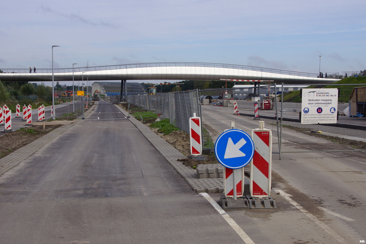 Elegante nieuwe loopbrug over de Rotterdamsebaan. Deze brug verbindt Drievliet met het bijbehorende parkeerterrein aan de andere zijde van de weg. De definitieve opgang bij Drievliet moet nog worden aangelegd.