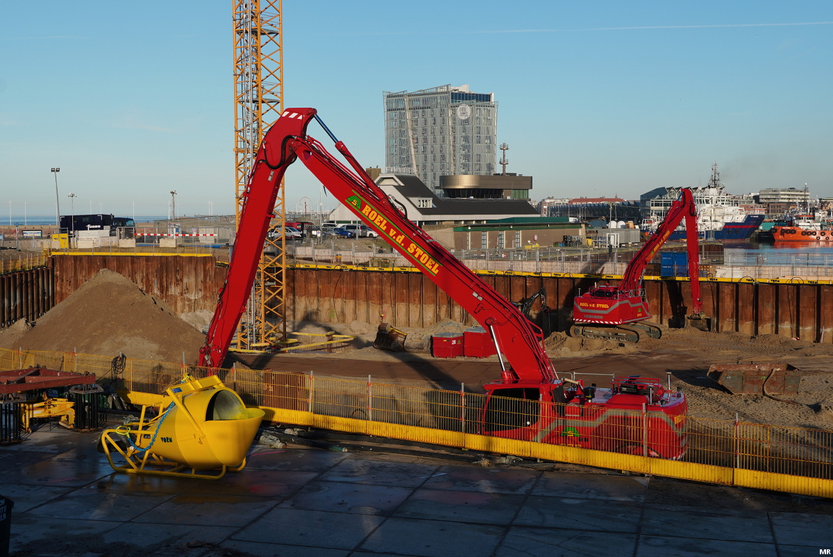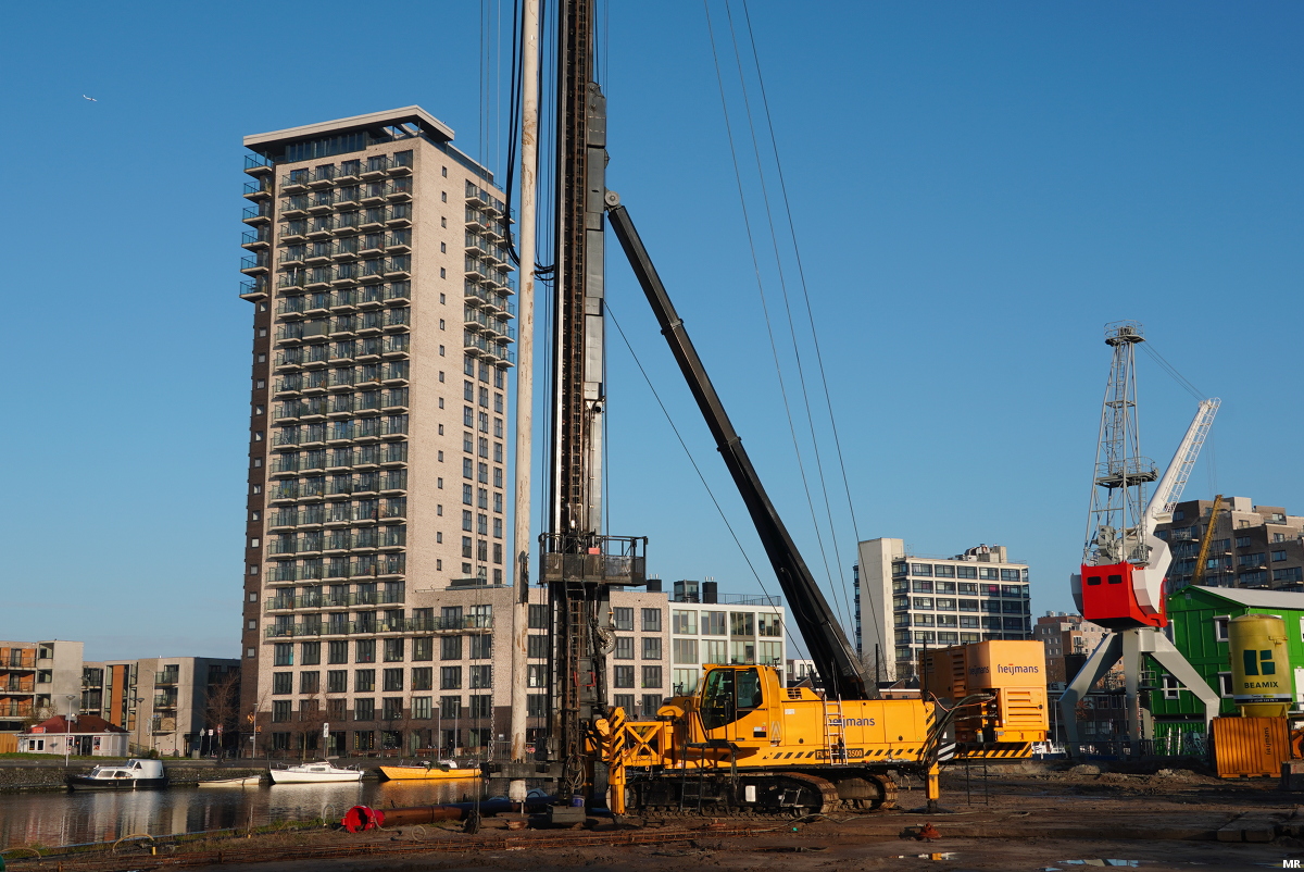 Aan de Petroleumhaven zijn de heiwerkzaamheden gestart voor woningbouwproject Havenmeesters. Hier verrijzen straks 2 torens van 74 en 53 meter hoog, samen goed voor 242 appartementen. Net als de toren op de achtergrond is dit gebouwencomplex ontworpen door Kampman Architecten.