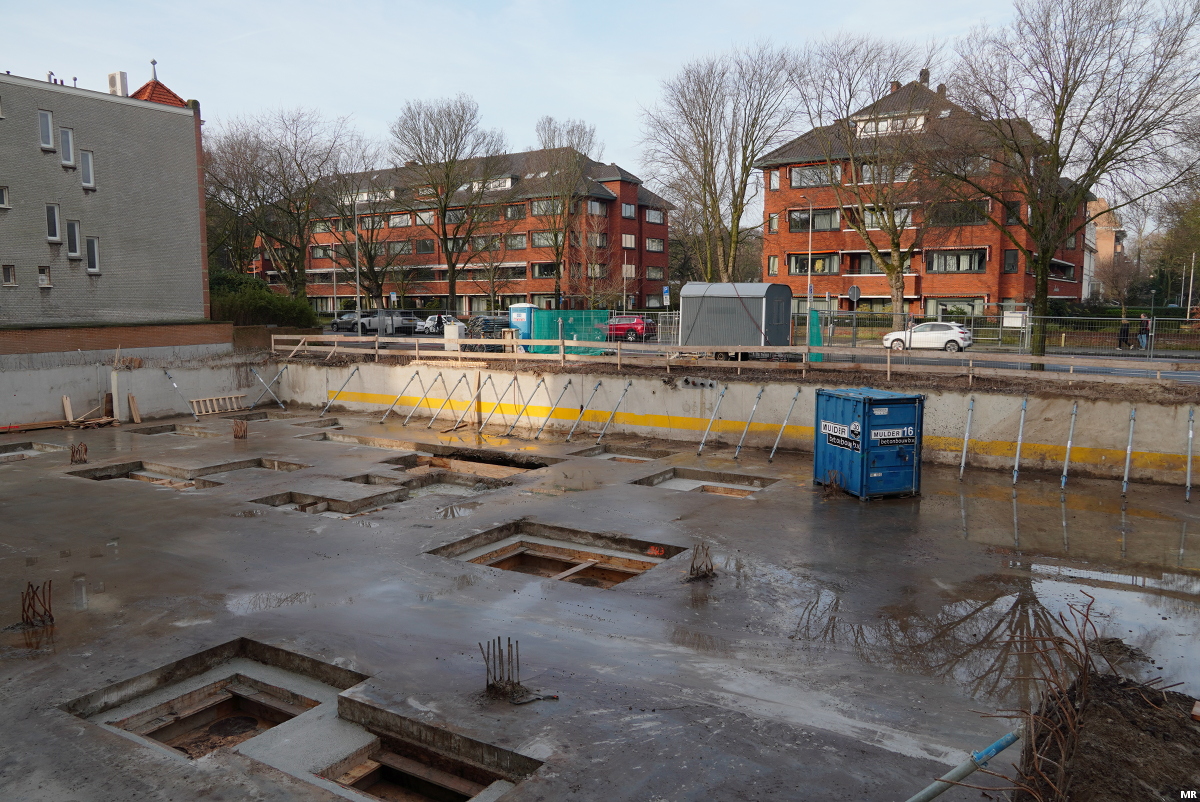 Aan de Bezuidenhoutseweg zijn de voorbereidende werkzaamheden gestart voor de bouw van woontoren B50. Achterop het terrein wordt een damwand in de grond gebracht zodat men kan graven zonder het aangrenzende water te verstoren.