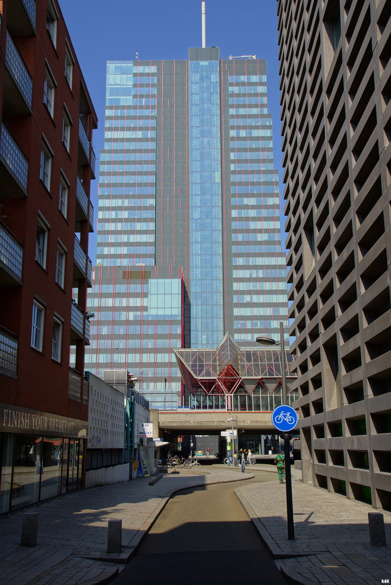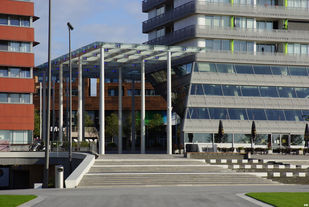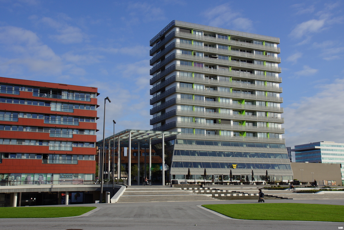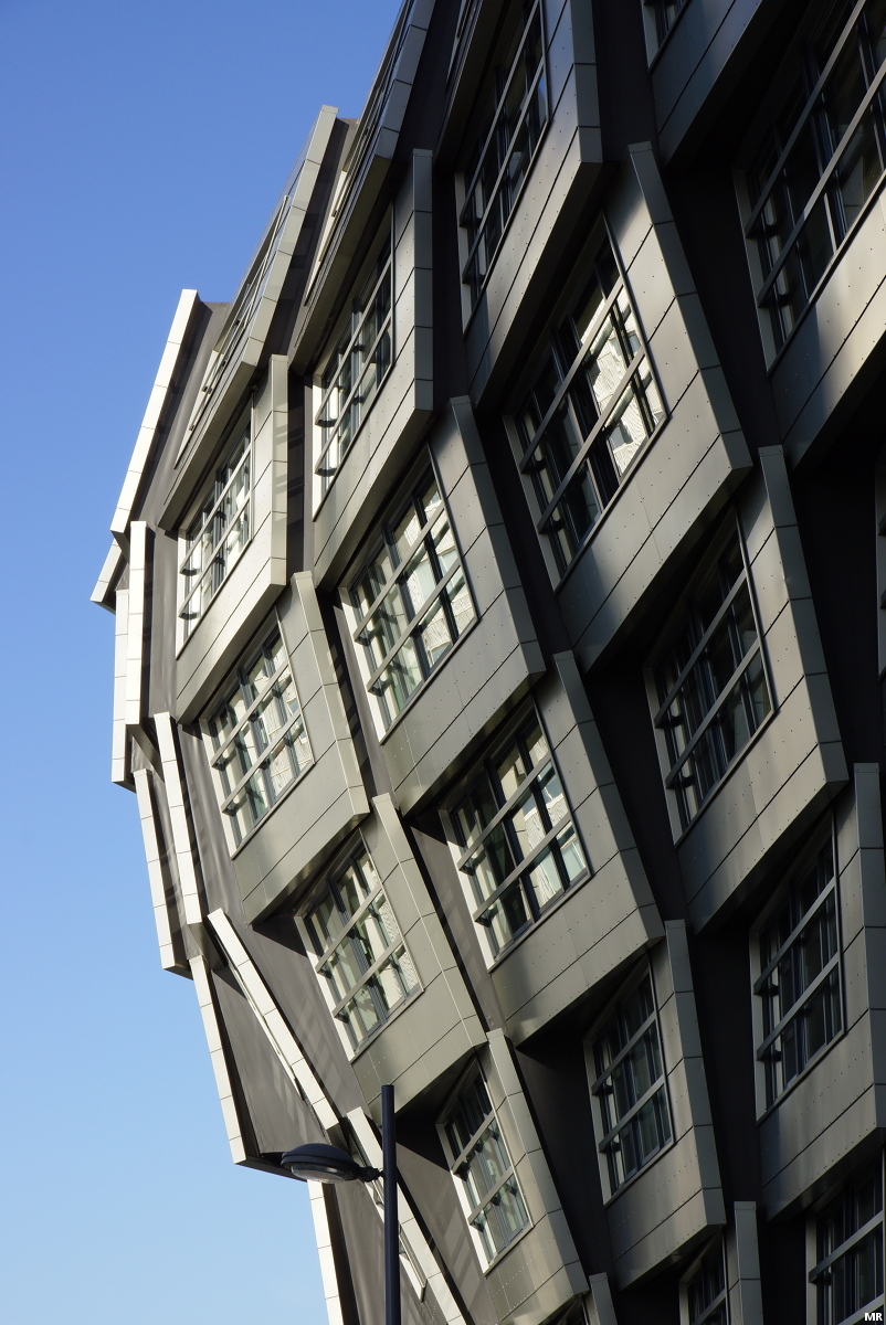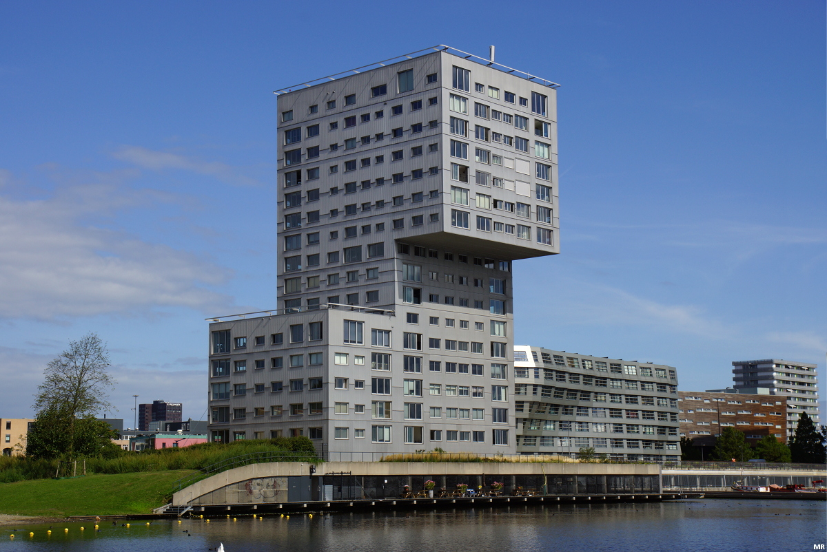 27. Het grijze woongebouw The Wave van architect René van Zuuk. Alle geveldelen hebben in dit gebouw net een andere hoek. Gezamenlijk vormen ze een golfbeweging die naar links (westen) toe steeds boller wordt.
