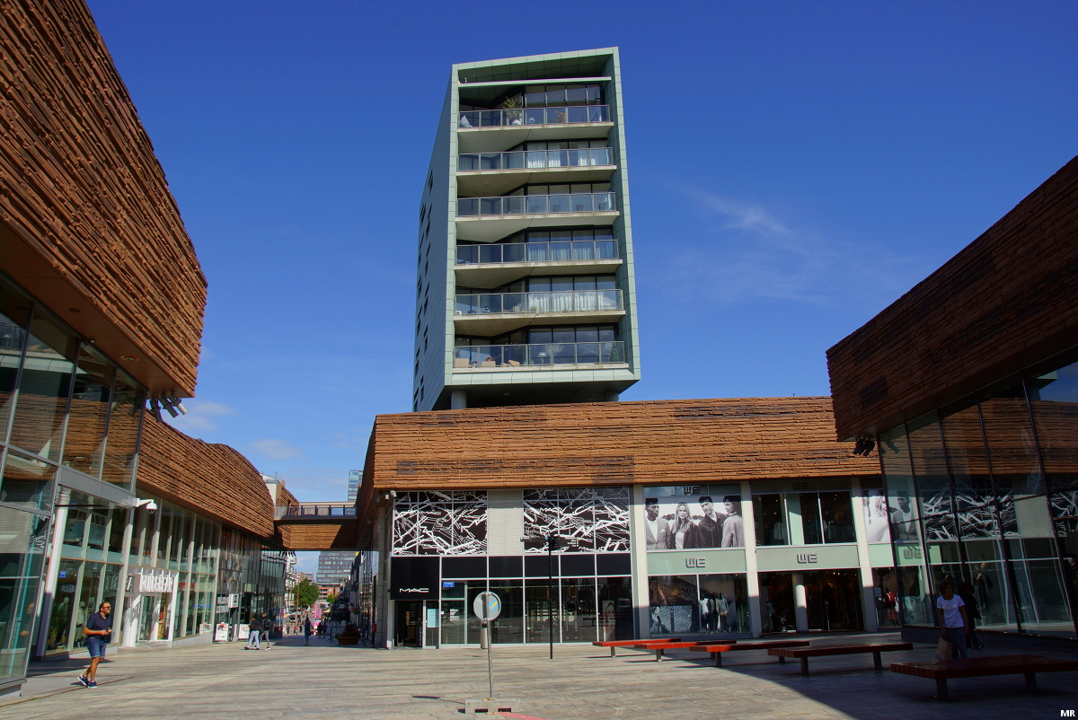 10. Midden in de binnenstad staat winkelcentrum Citadel van B+M Architecten. Dit in 2006 opgeleverde complex fungeert als het hart van het Almeerse winkelcentrum. Vanuit de lucht gezien heeft het complex een vierkant plattegrond, alleen is het zo'n 30 graden gedraaid ten opzichte van de oudere bouwblokken. Door deze afwijkende hoek zijn aan alle kanten van het complex driehoekige pleinen ontstaan. In elke zijde van het vierkant is een opening gemaakt vanwaar je het centrale pleintje kunt bereiken.