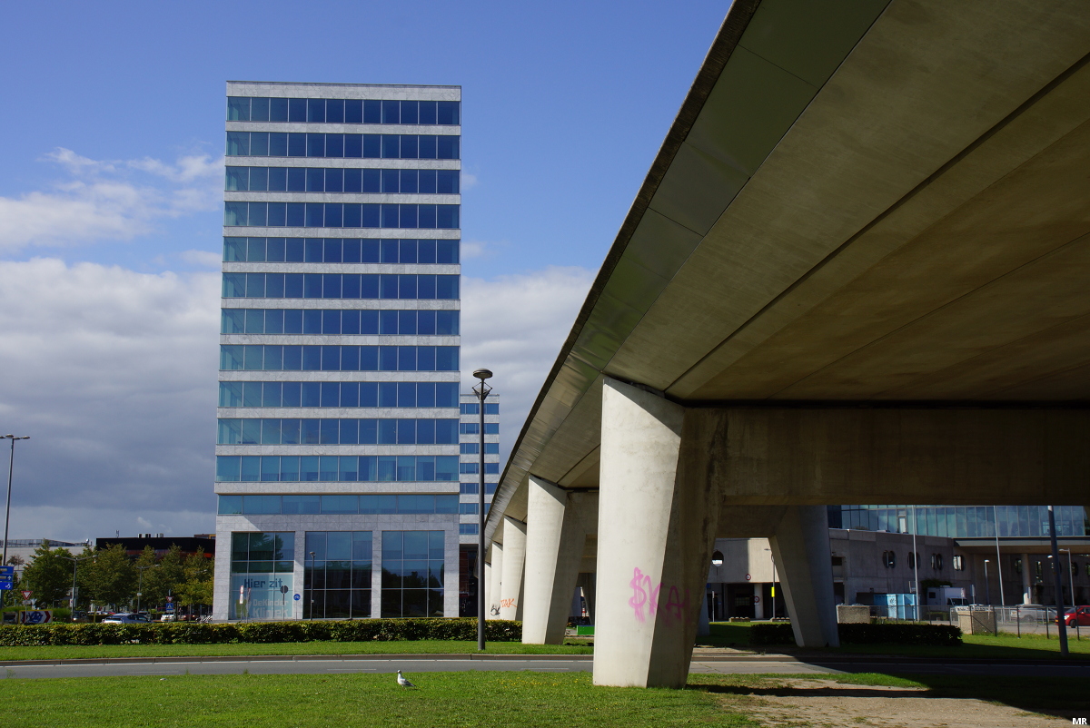 22. Op een langgerekte bouwkavel tussen de Hospitaaldreef en de opgetilde busbaan is in 2011 kantoorgebouw De Landdrost opgeleverd. Een ontwerp van ZZDP architecten dat opvalt door zijn luxe witte marmeren bekleding uit Italië. Op grotere afstand kun je door veel verdiepingen heen kijken, dus het lijkt momenteel niet zo goed te gaan met de verhuur.