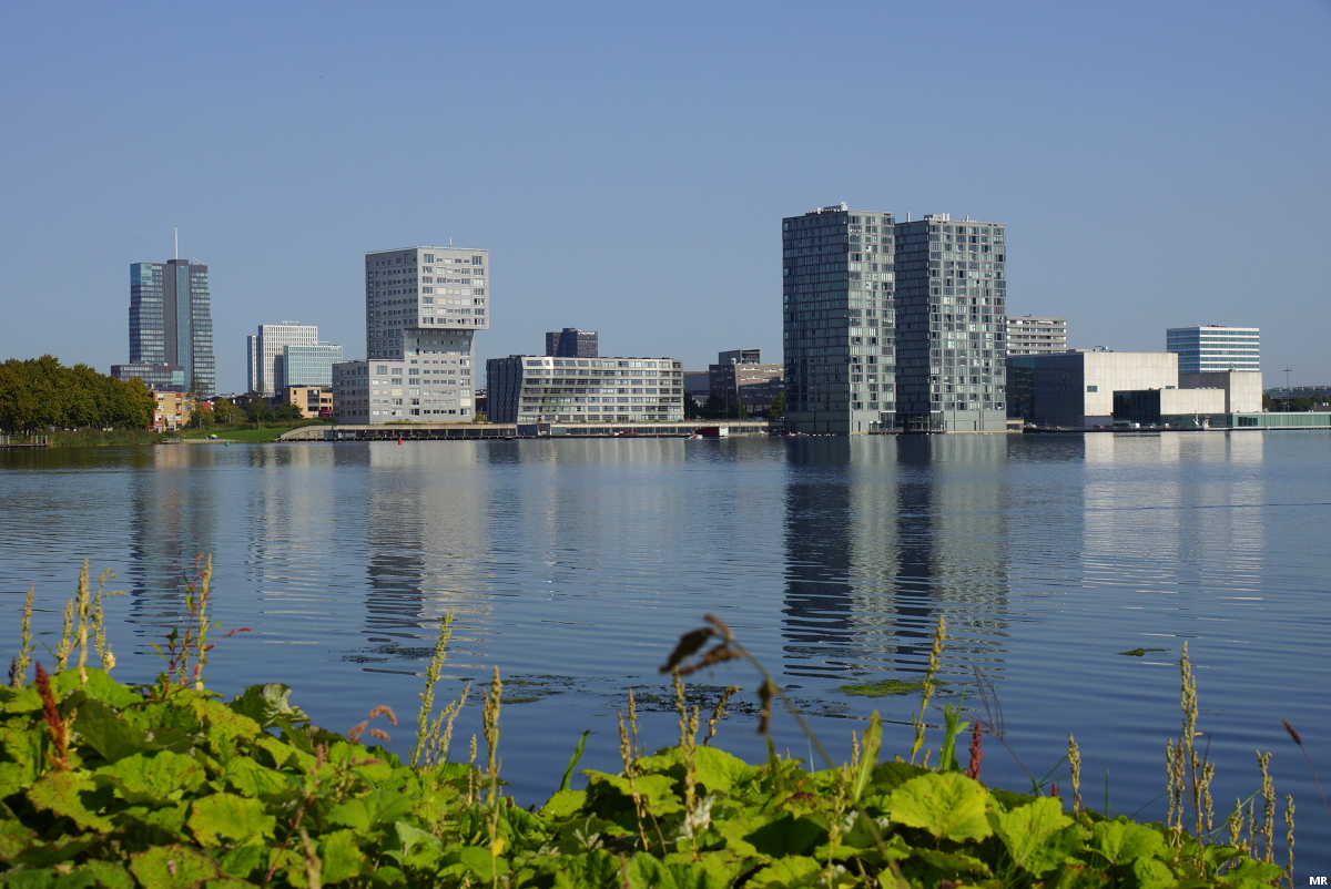 30. Vanaf de overzijde van het Weerwater heb je mooi zicht op de skyline van Almere.