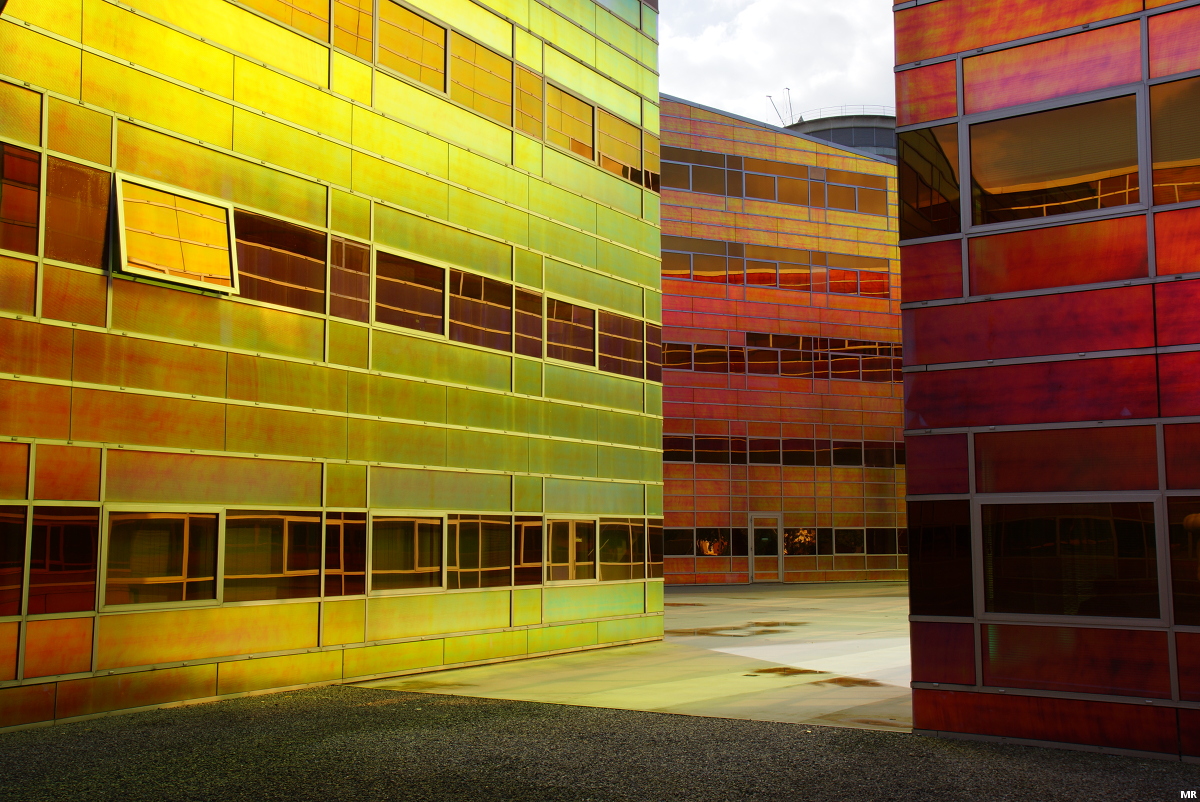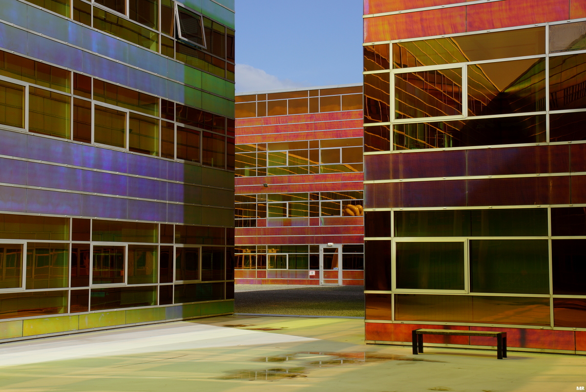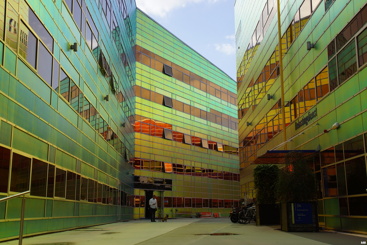 35. Een klein stukje ten noorden van Almere Centraal staat het spectaculaire kantoorgebouw La Defense. Dit gebouw is in 2004 opgeleverd naar ontwerp van UN Studio. Aan de buitenkant valt het gebouw door zijn grijze gevel nauwelijks op, dus als je er niet bekend mee bent dan loop je er zo aan voorbij. Wanneer je via een smal straatje het terrein betreedt dan kom je terecht in een bizar kleurig landschap. Een eldorado voor elke fotograaf.