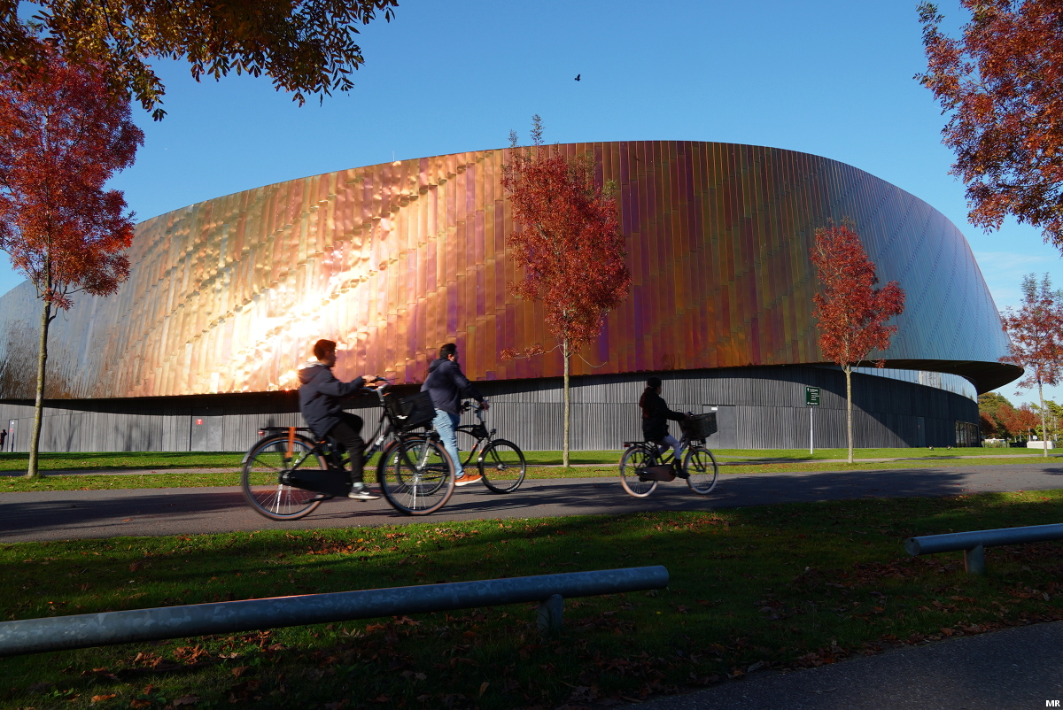 1. Vanaf de oude hoofdentree aan het Veluweplein rijd je via de Meester P. Droogleever Fortuynweg het park in. Deze weg begeleidt je direct naar de karakteristieke sportcampus. In de ochtend wordt het zonlicht weerkaatst in de glimmende roodgele gevel.