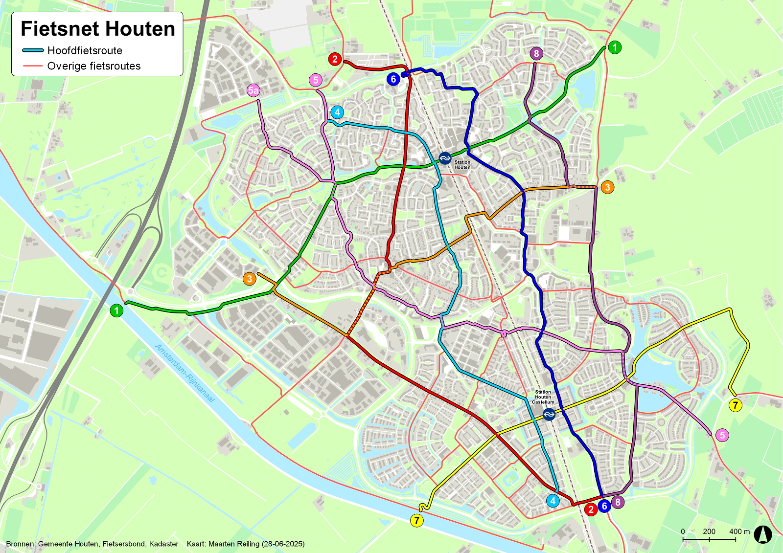 1. Voor de oriëntatie van fietsers heeft de gemeente Houten in samenwerking met de fietsersbond een fietskaart ontwikkeld waarbij de acht belangrijkste fietsroutes als een soort metronetwerk op de kaart zijn geprojecteerd. Elke lijn heeft een andere kleur en nummer. De dunnere rode lijnen zijn verbindingsroutes daartussen. Delen van dit netwerk zijn uitsluitend te gebruiken door fietsers, terwijl men op andere delen het fietspad moet delen met autoverkeer. Maar ook dan heeft de fietser voorrang. Aanvankelijk werd je als fietser met behulp van de kaart en een qr-code naar de gewenste plek begeleid, maar deze qr-code werkt inmiddels niet meer.
