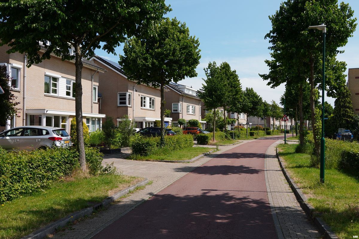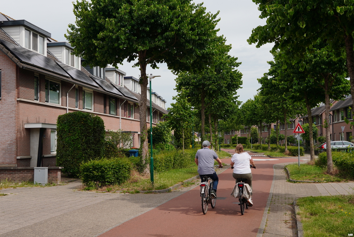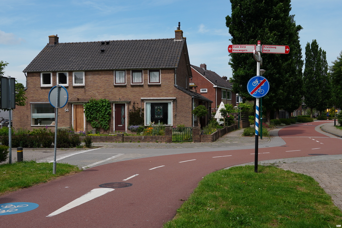 8. Prinses Ireneweg, nabij de oude dorpskern. Hier kruisen fietsroutes 3 en 4 elkaar. Het zichtbare rode fietspad is van route 4.