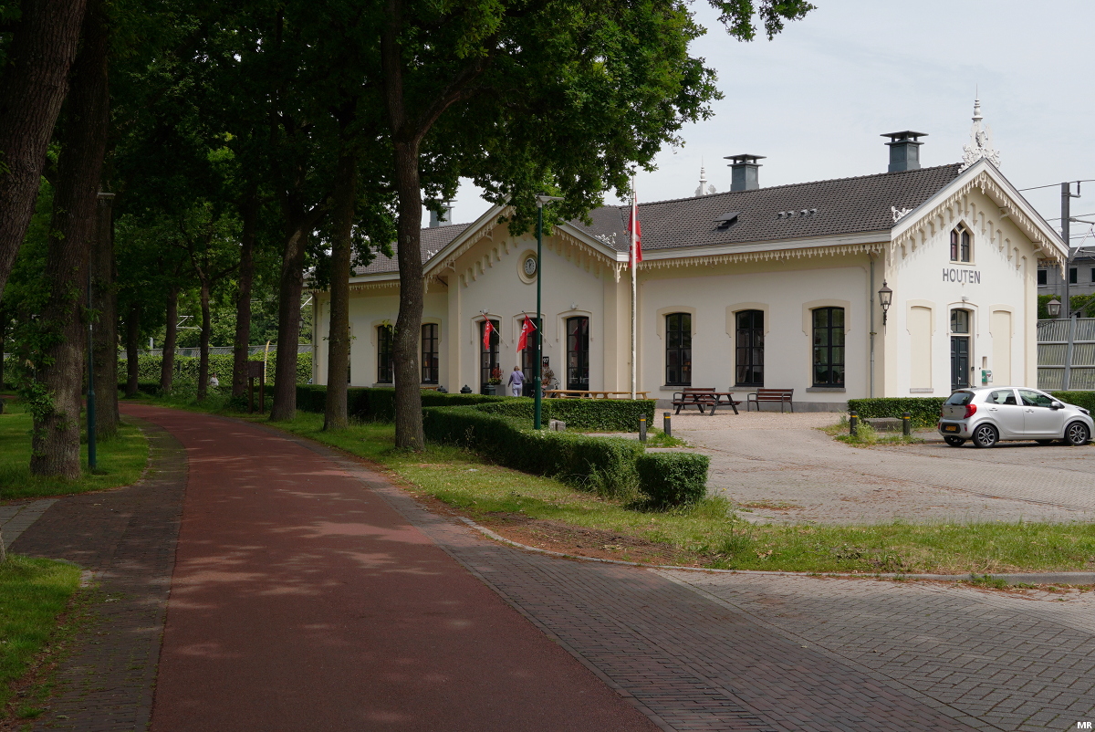 9. Het oude stationsgebouw van Houten stamt uit 1868. Het gebouw is ontworpen door architect Karel Hendrik van Brederode, een architect die tussen 1860 en 1890 wel meer stationsgebouwen tekende voor de Staatspoorwegen. In het begin van deze eeuw was men van plan om het station te slopen om zo verdubbeling van het spoor mogelijk te maken. Uiteindelijk is ervoor gekozen om het complete gebouw op te tillen en zo'n 150 meter richting het zuidoosten te verplaatsen. Nu staat het gebouw nog steeds langs het spoor, maar niet meer op de oorspronkelijke locatie.
