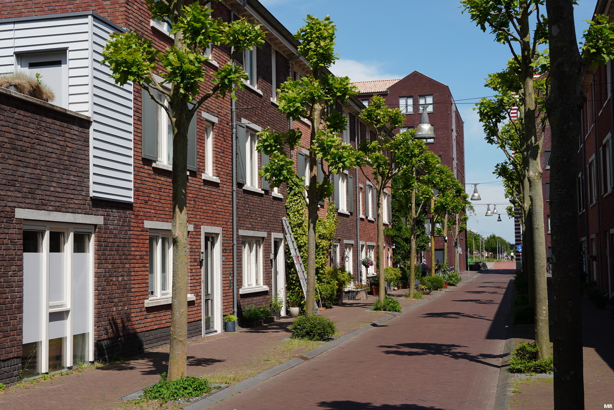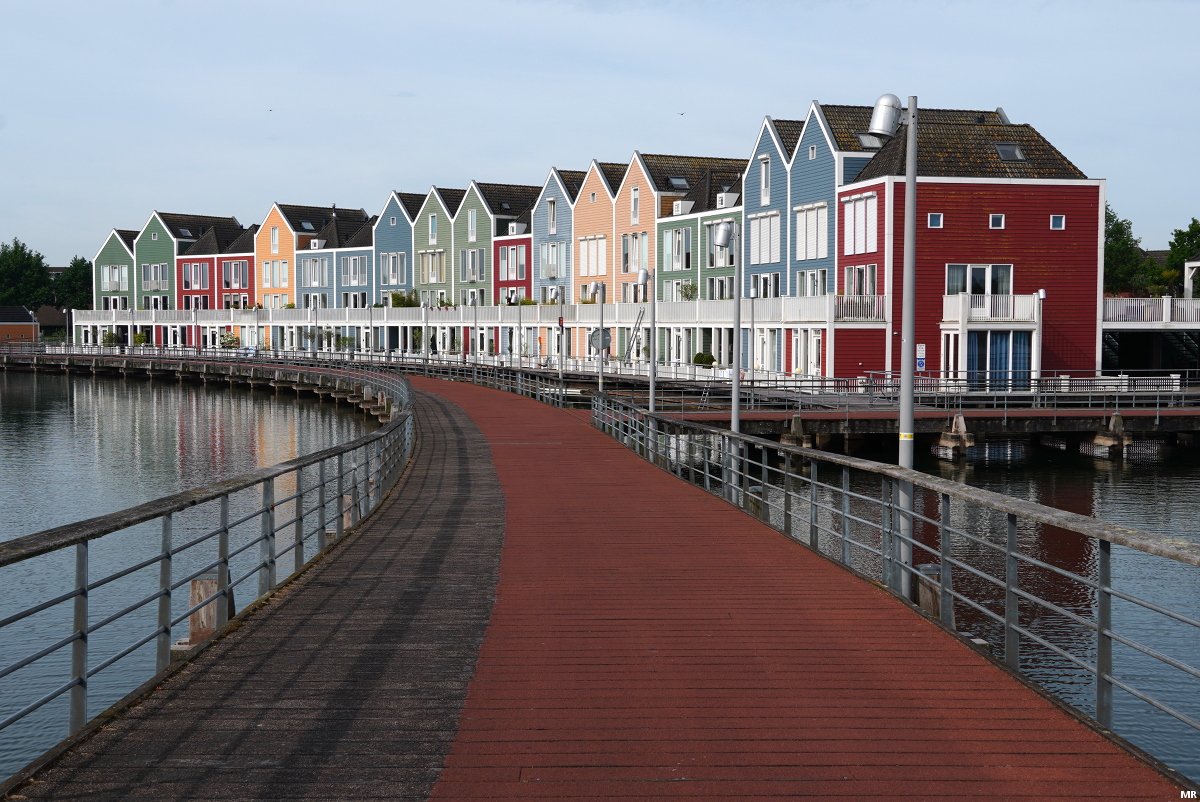 17. De kleurrijke woonhuizen op de Rietplas, gezien vanaf de Kniphoeksbrug. De architect van deze woonhuizen liet zich inspireren door Zweedse houten houten.