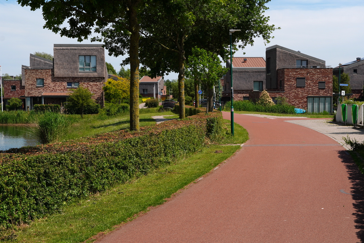 18. Fietspad richting villapark De Rietmeesters. 18 villa's met rieten daken, gelegen aan het water.