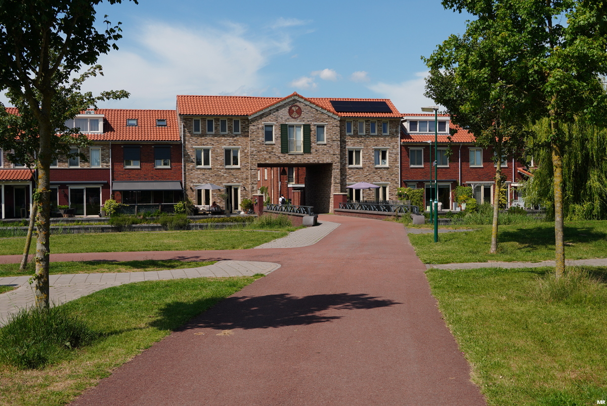 19. Toeganspoort tot het centrum van Castellum. Het fietspad perst zich tussen deze twee blokken door.
