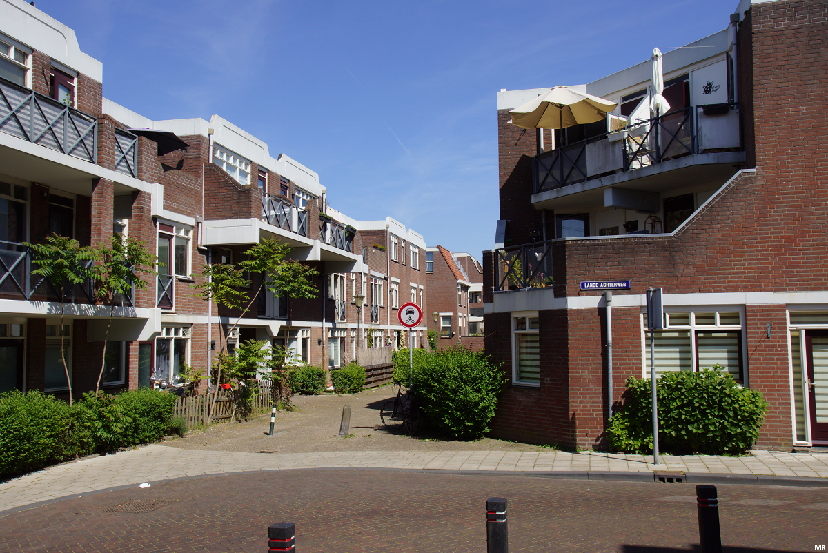 55. Het Spinhuispad met de karakteristieke rode erkertjes van wooncomplex Branderspoort.