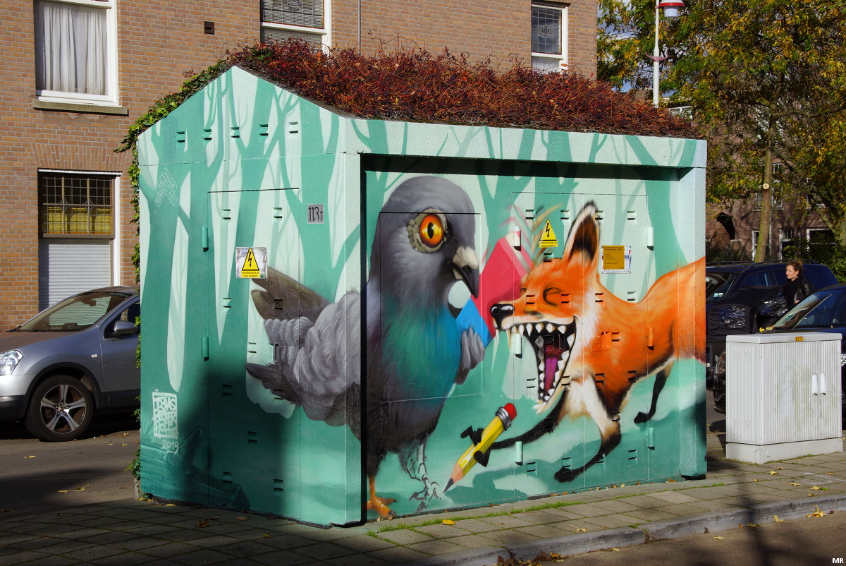 Vos tekent duif op trafohuisje aan de Thomsonlaan in Bloemenbuurt.