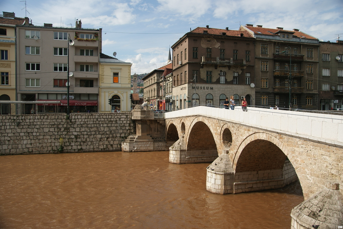 10. De Latijnbrug over de rivier Miljacka. Hier zou de aarthertog Frans Ferdinand van Oostenrijk in 1914 zijn vermoord door de Servische nationalist Princip. Deze moord zou uiteindelijk het startsein blijken voor de Eerste Wereldoorlog.