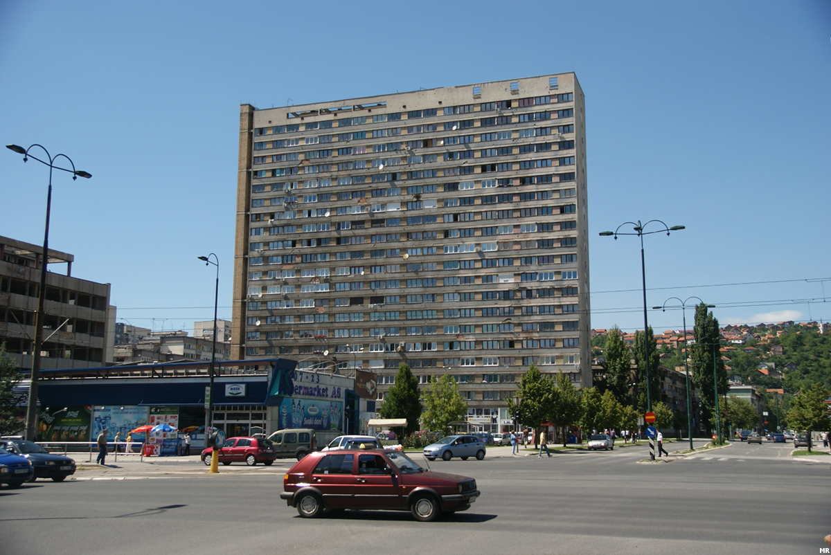 20. Het kantoor van de krant Oslobodenje (Vrijheid) werd in de oorlog vrijwel compleet verwoest. Alleen de liftschacht van dit gebouw bleef staan. Na de oorlog had men ideeën om deze liftschacht te laten staan als een soort monument, maar blijkbaar is dat idee snel overboord gegooid. Tegenwoordig heet de krant Avaz.