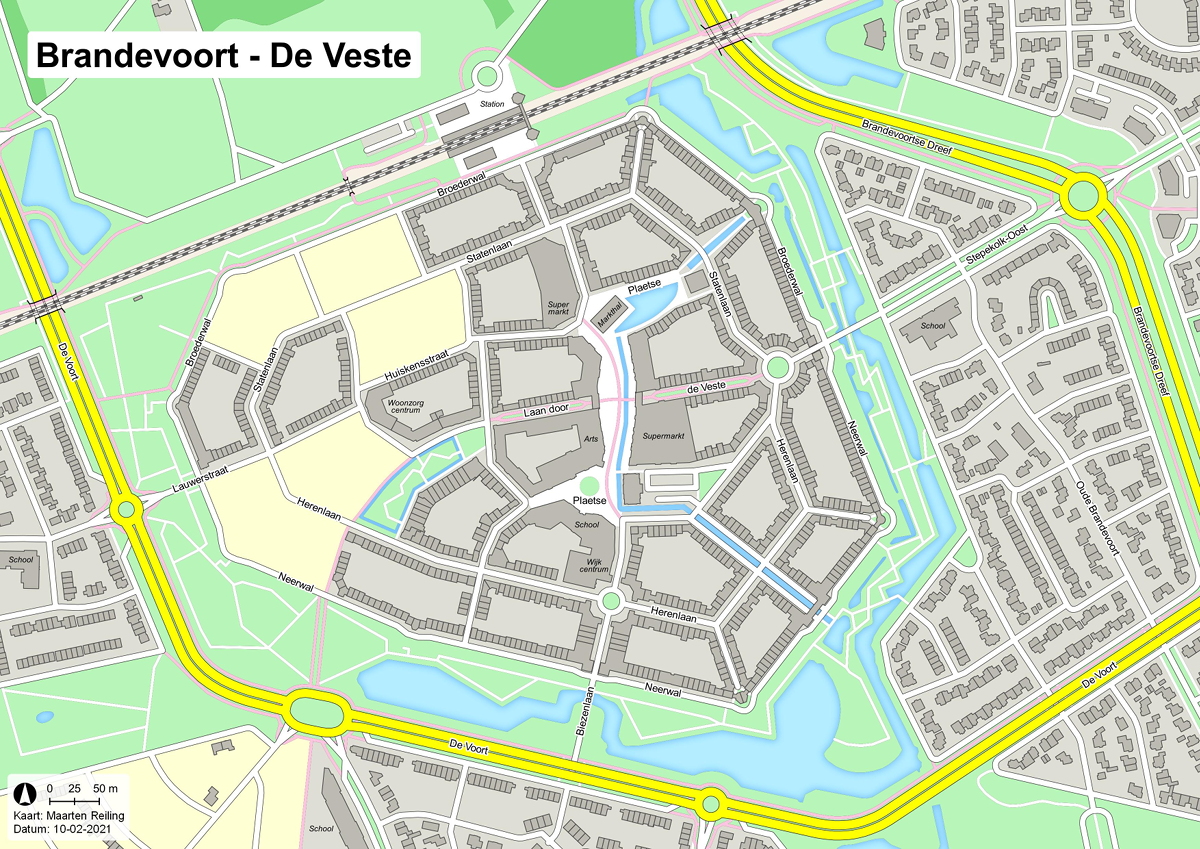 1. Allereerst een kaart van De Veste voor het overzicht. De Veste bestaat uit 28 gesloten bouwblokken, waarvan inmiddels 23 zijn gerealiseerd. Uiteindelijk moet dit gebied 1435 woningen gaan tellen, waarmee ruimte wordt geboden aan zo'n 3000 inwoners. Aan de oost-, west- en zuidkant wordt De Veste begrensd door een ecologische zone. Aan de noordkant zorgt het spoor voor de begrenzing.