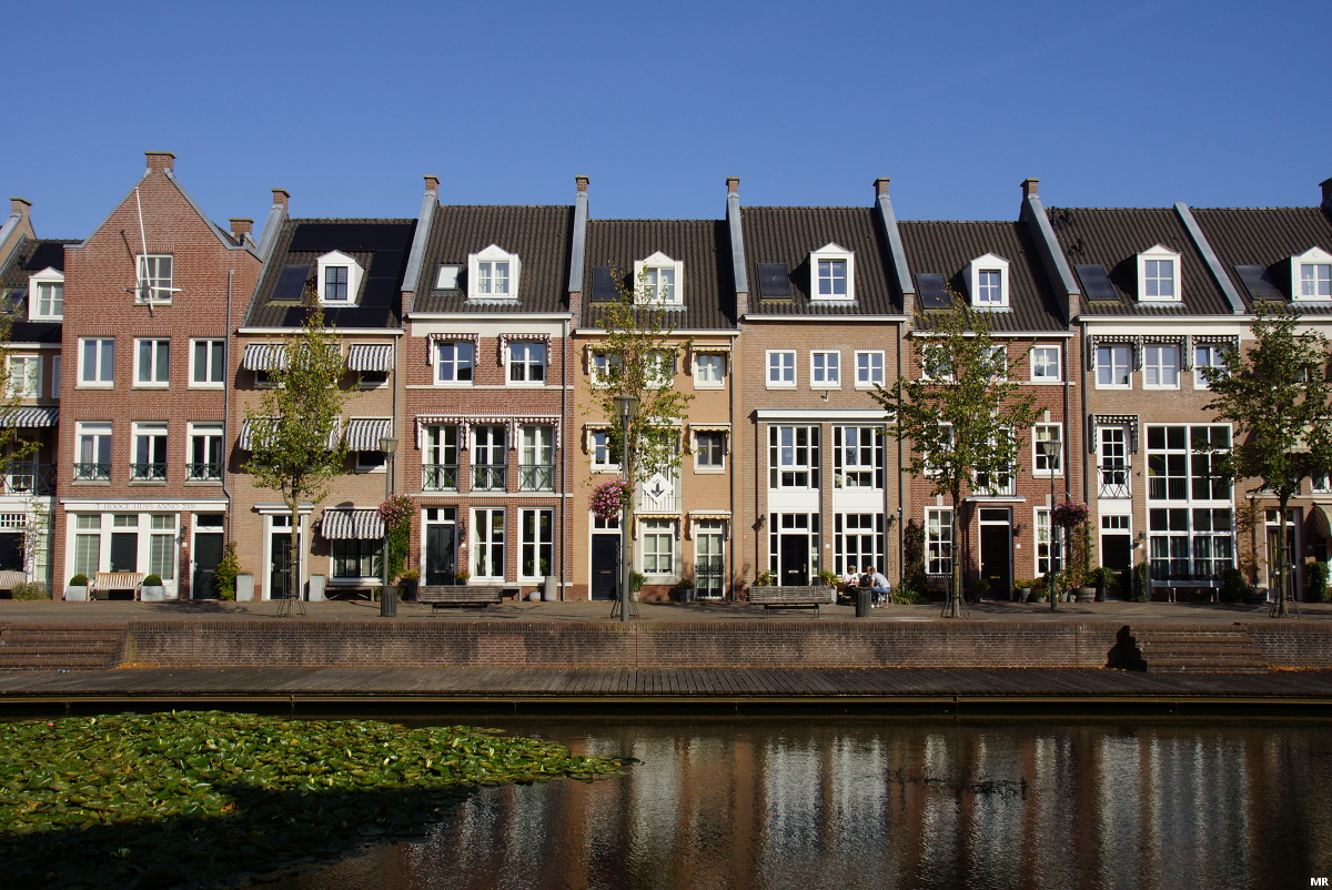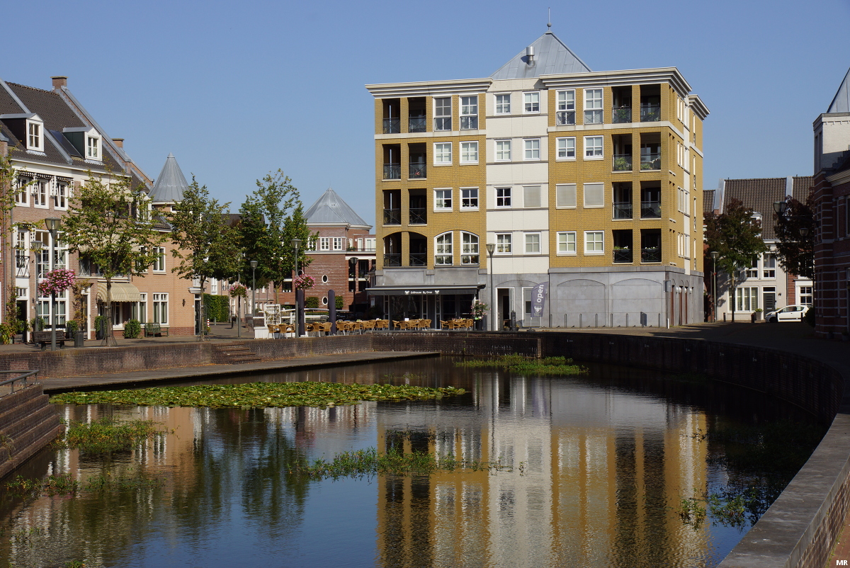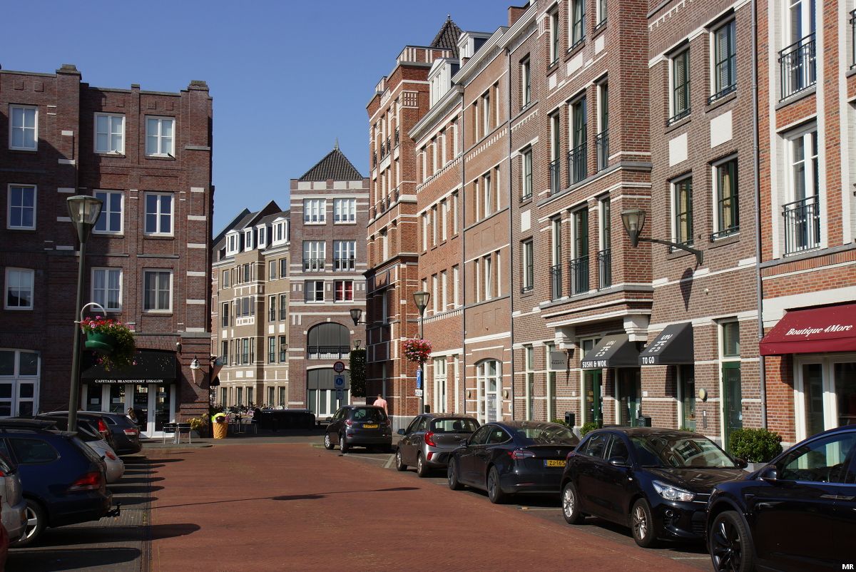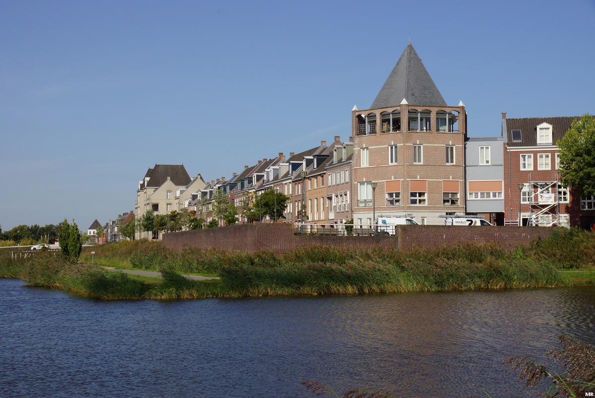 22. Het stadscentrum van Brandevoort bestaat uit twee gebogen straatwanden met daartussen een ovaal plein. De bebouwing is over de hele straat 5 lagen hoog, waarbij de hoekpanden zijn voorzien van iets hogere torentjes. Aan de oostzijde ligt de gracht (bij de boompjes).