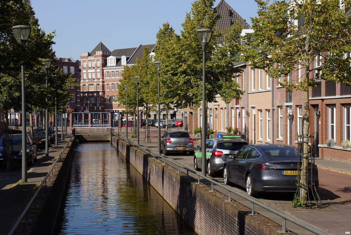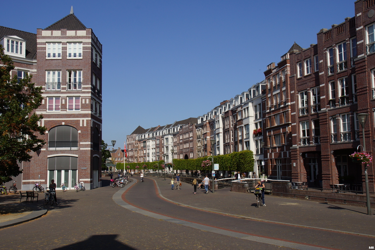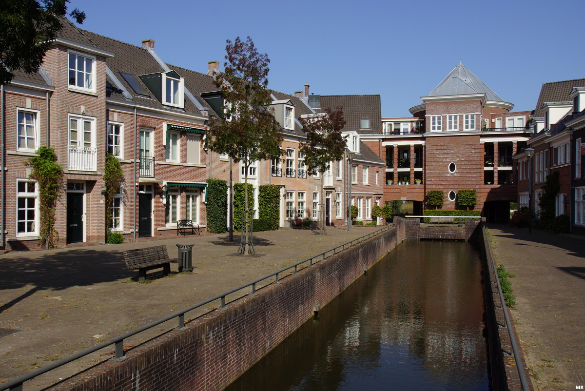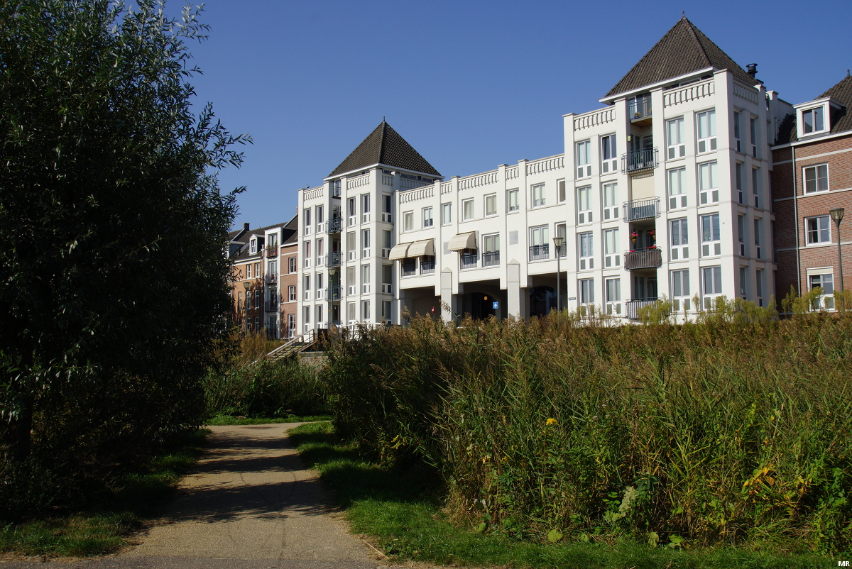 22. Het stadscentrum van Brandevoort bestaat uit twee gebogen straatwanden met daartussen een ovaal plein. De bebouwing is over de hele straat 5 lagen hoog, waarbij de hoekpanden zijn voorzien van iets hogere torentjes. Aan de oostzijde ligt de gracht (bij de boompjes).