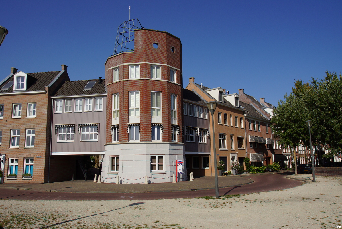 41. Torentje boven de ingang van een woonzorgcentrum aan de Vaartsestraat, gezien vanaf de Lauwerstraat. Helaas staat dit accent net niet in het uiteinde van de as. Dus een grote kans dat het torentje aan het zicht wordt onttrokken wanneer het bouwblok rechts wordt opgetrokken.