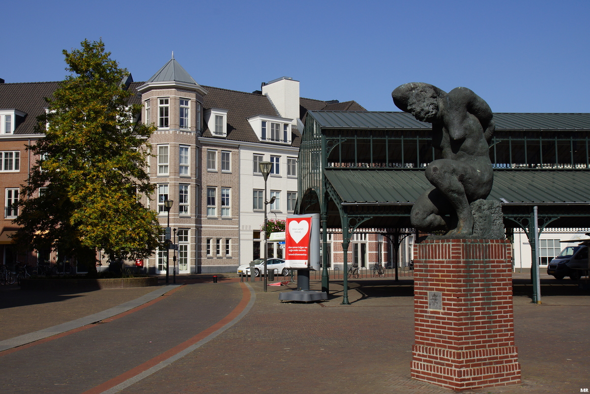 25. Naast architect is Rob Krier ook fervent beeldhouwer. Regelmatig is in de buurt van zijn gebouwen ook een door Krier vervaardigd standbeeld te vinden. Centraal in Brandevoort staat dit beeld 'Absorbed'. Direct daarachter staat de markthal. Eveneens ontworpen door Krier.