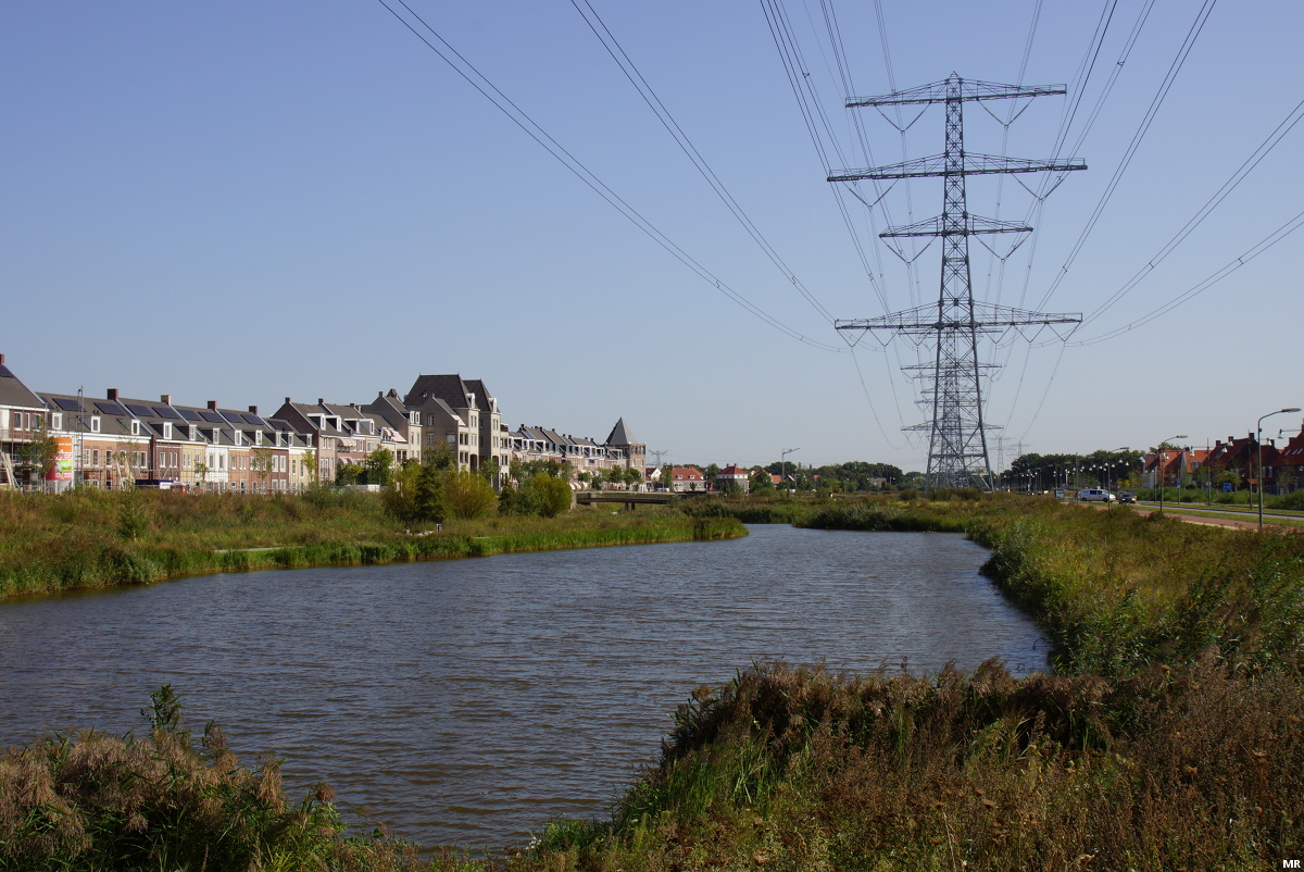 37. Rond De Veste ligt een brede groenstrook. De aanwezige hoogspanningsmasten hebben er mede voor gezorgd dat hier niks is gebouwd.