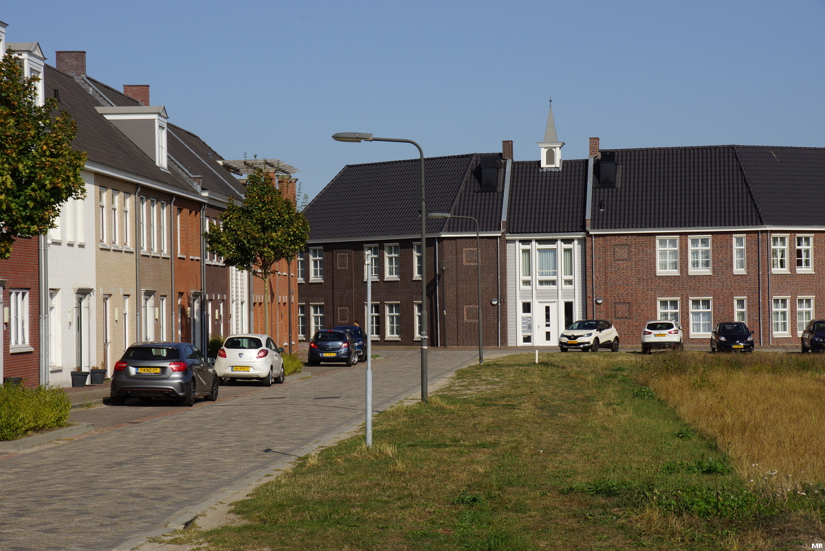 32. Het enige dat ontbreekt in Brandevoort is een centrale kerk. Een gebouw dat dient als markering van het centrum, een baken dat je van verre kunt zien. Aan de Herenlaan is toch een soort kerk zichtbaar in de bebouwing. Het schip is eigenlijk een sporthal van OBS Brandevoort, terwijl de toren een huls is voor de lift en trappenhuis voor de appartementen aan de Biezenlaan. Beide onderdelen zijn ontworpen door architectenbureau KOW, dus het is niet toevallig dat deze twee onderdelen samenhang vertonen.