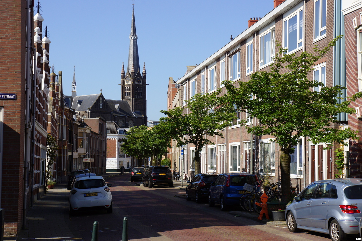 27. Zicht over de Oranjestraat richting de Nieuwe Haven. Aan het einde staat de in 1977 opgeleverde flat Over de Vesten. Dit als schrale vervanging van de majestueuze toren van de Frankelandkerk die hier tot 1969 stond.