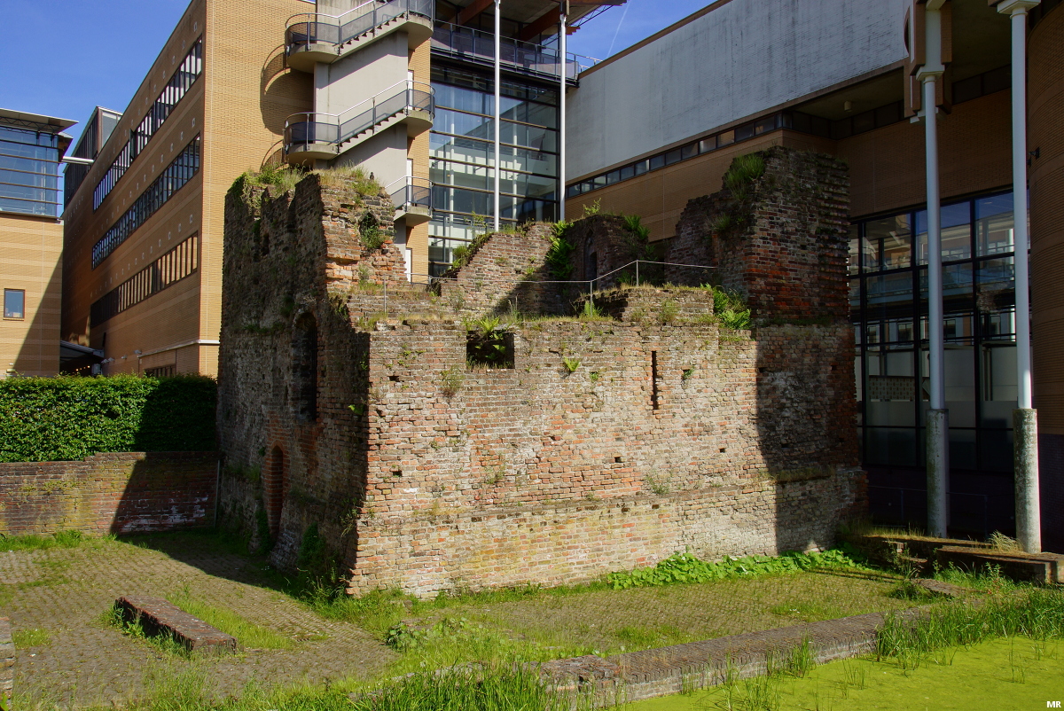 4. Naast het Schiedamse stadhuis liggen de resten van Slot Mathenesse ofwel Huis te Riviere. Dit kasteel werd in de 13e eeuw gebouwd in opdracht van de regentes van Holland: gravin Aleida van Avesnes. In hoofdlijnen bestond het kasteel uit een hoge bakstenen donjon met een aansluitende ringmuur. Vandaag de dag resteert alleen een stuk van de donjon. Helaas doet de huidige inrichting van de locatie geen recht aan de lange geschiedenis. Aan twee zijden wordt deze archeologische vindplaats begrensd door achterkanten van het stadhuis. Achteraf gezien was het beter om het stadhuis iets meer over het monumentale Stadserf te bouwen om om zo achter het stadhuis meer ruimte te behouden voor de ruïne.