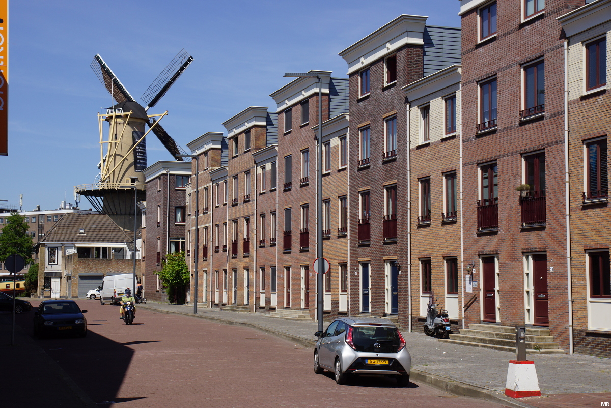 50. Zicht over de Schiedamse Schie richting molen De Kameel. Langs de kade wordt de laatste hand gelegd aan een rijtje eengezinswoningen van project Dirkzwager. De nieuwbouw voegt zich hier naadloos in de bestaande gevelrij. Zodra de hekken weg zijn dan lijkt het alsof de panden er altijd al bij hoorden.