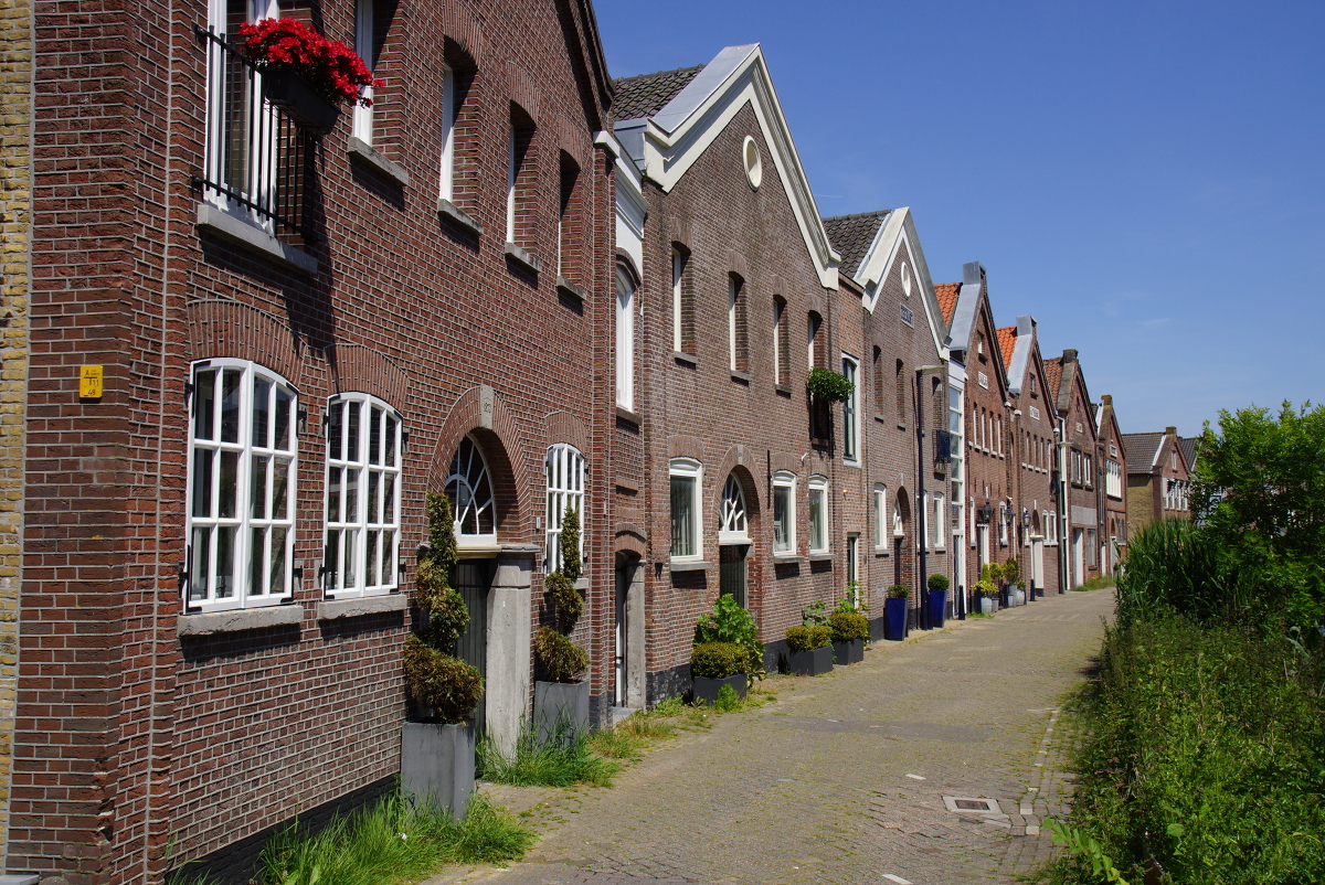 55. Het Spinhuispad met de karakteristieke rode erkertjes van wooncomplex Branderspoort.