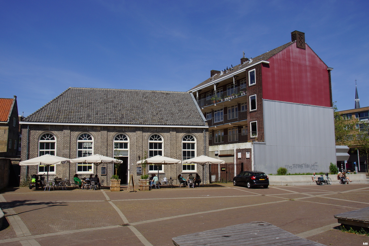28. De voormalige Lutherse Kerk aan de Westveste staat nu nog volop in het zicht, maar is inmiddels ingepakt door Stadsherstel Maassteden. Na de grondige renovatie wordt dit pand aangeboden voor verhuur.